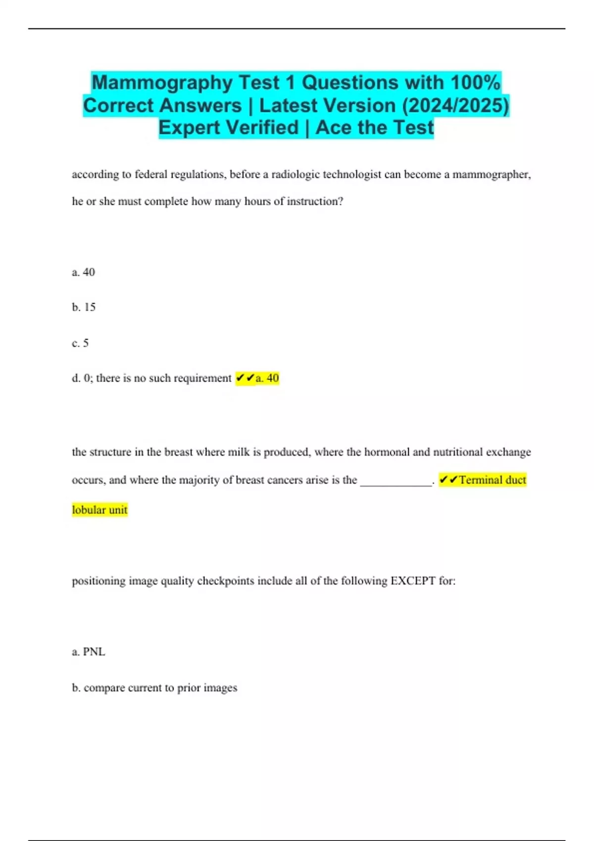 Mammography Test 1 Questions with 100% Correct Answers | Latest Version (2024/2025) Expert Verified | Ace the Test