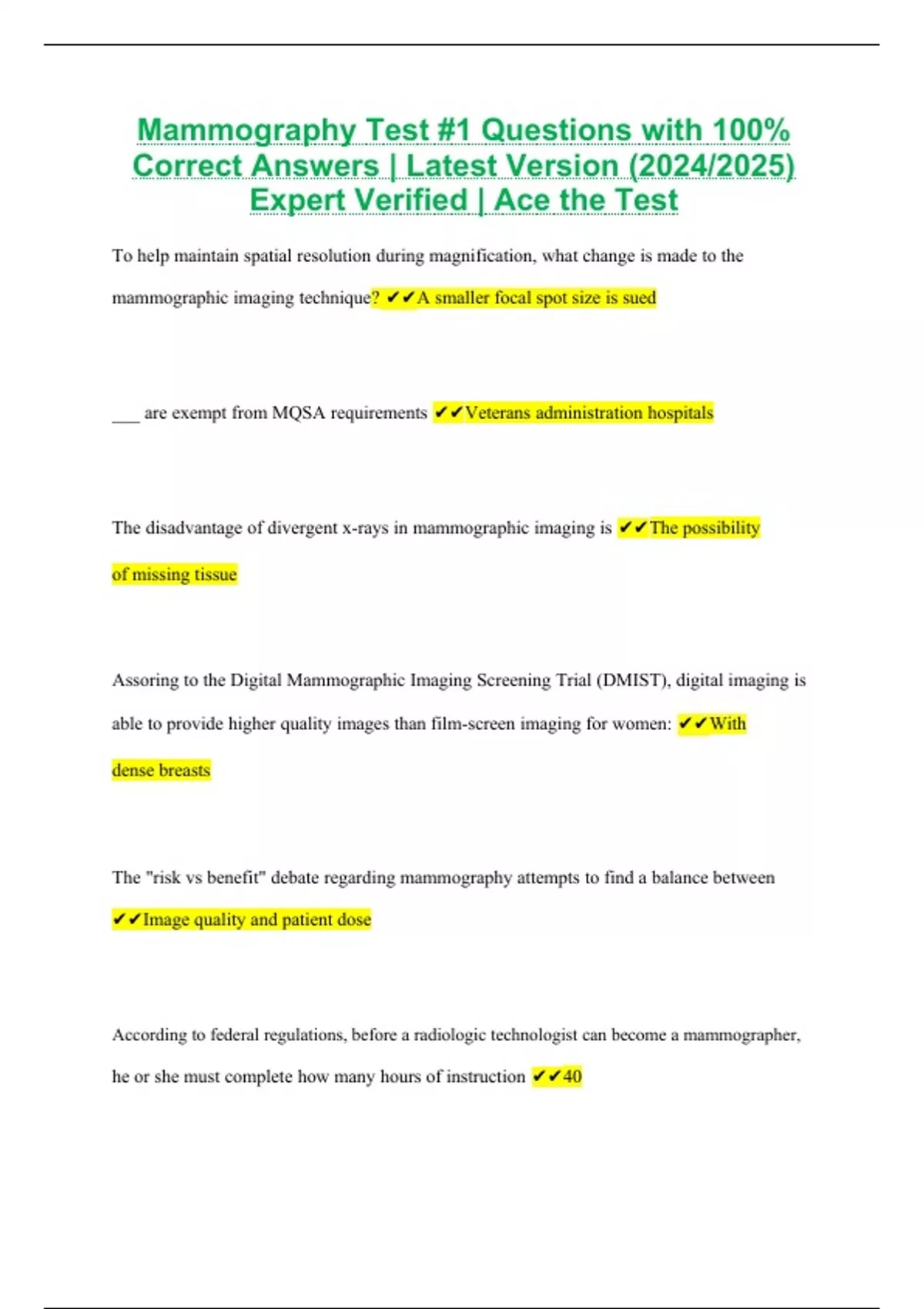 Mammography Test #1 Questions with 100% Correct Answers | Latest Version (2024/2025) Expert Verified | Ace the Test
