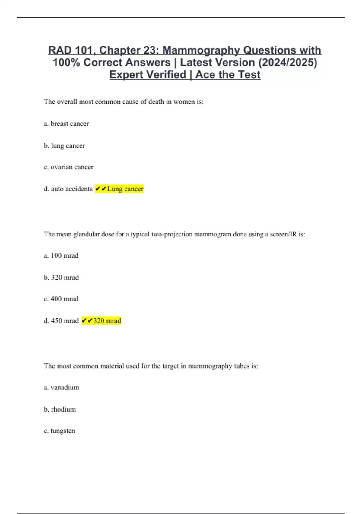 RAD 101, Chapter 23: Mammography Questions with 100% Correct Answers | Latest Version (2024/2025) Expert Verified | Ace the Test