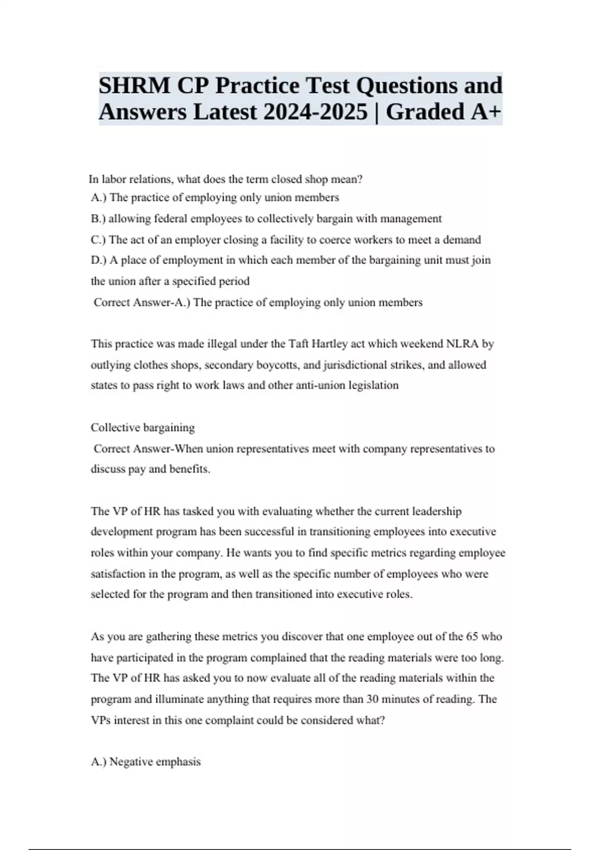 SHRM CP Practice Test Questions and Answers Latest | Graded A+. The VP of HR has tasked you with evaluating whether the current leadership development program has been successful in transitioning employees into executive roles within your company. He wants you to find specific metrics regarding employee satisfaction in the program, as well as the specific number of employees who were selected for the program and then transitioned into executive roles. As you are gathering these metrics you discover that one employee out of the 65 who have participated in the program complained that the reading materials were too long. The VP of HR has asked you to now evaluate all of the reading materials within the program and illuminate anything that requires more than 30 minutes of reading. The VPs interest in this one complaint could be considered what? A.) Negative emphasis SHRM CP Practice Test Questions and Answers Latest | Graded A+ B.) Gross-up C.) Just cause D.) Permissive issue Correct Answer-A.) Negative emphasis Negative emphasis occurs when a disproportionate amount of time is spent resolving one minor complaint. Reducing the cost per hire is an ongoing process for HR departments and involves a range of options. Which of the following options is least two likely to reduce the cost per hire? A.) Incentivizing existing employees to find suitable candidates B.) Increasing on-boarding efforts C.) Switching to a cheaper recruiting agency D.) Making use of social media Correct Answer-B.) Increasing on-boarding efforts Increasing on-boarding efforts is the least likely way to reduce the cost per hire. Along with the other three choices reducing cost per hire may be done by using HR software to reduce cost by allowing companies to organize candidate data, sift through applicants, and manage the whole recruitment process cost effectively. Advance HR professional serve as there are organizations representative, working to understand the position of all negotiating parties to achieve a mutually acceptable resolution. Which of the following is not an indication of an HR professionals proficiency in negotiating skills? A.) Negotiates with stakeholders within and outside of the organization in complex and high-stake negotiations B.) Defines the parameters of negotiating boundaries on behalf of the HR unit C.) Negotiates organizational initiatives in communications with stakeholders D.) Achieves a mutually acceptable agreement and difficult and complex negotiations Correct Answer-C.) negotiates organizational initiatives in communications with stakeholders An HR professional would not negotiate organizational initiatives and communications with stakeholders. HR professional support and guide organizational initiatives but do not negotiate them with all stakeholders. There are three main bargaining subjects in union negotiations. They are mandatory subjects, permissive subjects and the third is which of the following? A.) security subjects B.) certification subjects C.) legal subjects D.) illegal issues Correct Answer-D.) illegal issues The third main bargaining subject is illegal issues. They are issues which are prohibited by the NLRA and include bargaining for clothes shop security agreements and limiting concerted activity of the employees and other unlawful behaviors. Training done via video on phone app is what type of learning? A.) Gamification B.) Benchmarking C.) M-learning D.) Knowledge management Correct Answer-C.) M-learning Your company is changing the direction of its business to keep up with the volving technology advances. Your tax was putting together a team of individuals to device a plan for changing the course of the business. Which of the following characteristics would be most helpful when choosing a leader for the team? A.) Reputation among employees B.) Charisma C.) Authoritative manner D.) Outstanding work record Correct Answer-A.) Reputation among employees A person's reputation (how a person is viewed and supported by those who've worked for them) is the core principle in finding a great leader. An employee has sent you an email stating that he is the "victim of discrimination" as a remote worker. Recently, a paper document detailing a new opening for a warehouse supervisor was distributed to all departments to be posted in public areas. Remote workers, who make up about 10% of the workforce at your company, were not notified. For that reason, none of them applied for the role. He just found out about the position from a friend who works in Accounting, but now the role is no longer open to new applicants. Which of the following is the best solution for this concern? A.) Conduct an HR audit to determine who was at fault in this situation and create a Performance Improvement Plan to prevent a similar situation in the future. B.) Reopen the posting for new applications and send out an email to all staff members notifying them of the open position. C.) Advise the Warehouse Manager that he can no longer hire a supervisor to fill that role until the next fiscal year. D.) Ask the remote worker who sent the email to file a claim with EEOC so they can investigate this charge of discrimination. Correct Answer-B.) Reopen the posting for new applications and send out an email to all staff members notifying them of the open position. I'm this case, the company risks alienating the remote workers in the company. The remote employees may begin to feel unwanted or not appreciated, causing morale and productivity to drop. HR should strive to treat all employees equally and correct situations in which one group of employees is given opportunities denied to another group. Three major issues in negotiating an expatriate assignment are which of the following? A.) tax issues, language issues, and family expenses B.) relocation costs, temporary housing, and family expenses C.) the actual negotiation, tax issues, and relocation costs D.) the actual negotiation, family expenses, and temporary housing Cor