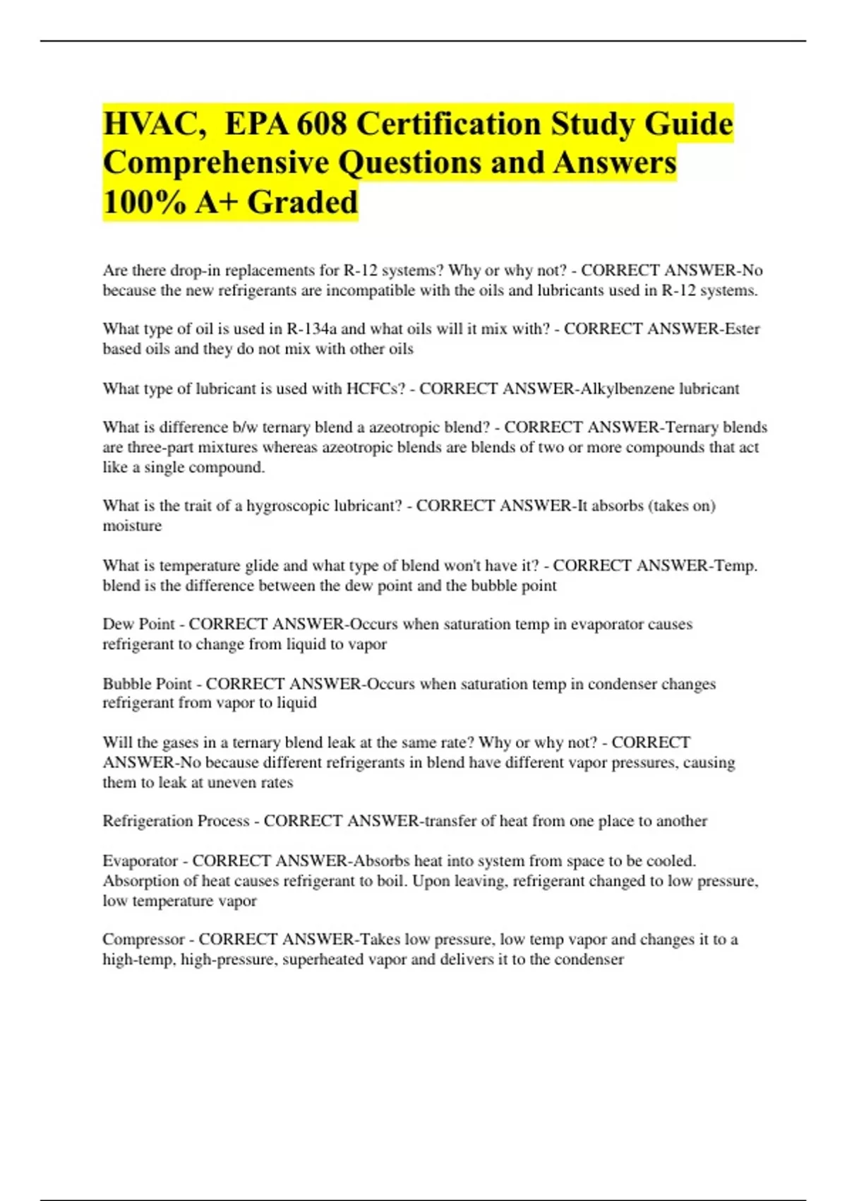 HVAC, EPA 608 Certification Study Guide Comprehensive Questions and Answers 100% A+ Graded Are there drop-in replacements for R-12 systems? Why or why not? - CORRECT ANSWER-No because the new refrigerants are incompatible with the oils and lubricants used in R-12 systems. What type of oil is used in R-134a and what oils will it mix with? - CORRECT ANSWER-Ester based oils and they do not mix with other oils What type of lubricant is used with HCFCs? - CORRECT ANSWER-Alkylbenzene lubricant What is difference b/w ternary blend a azeotropic blend? - CORRECT ANSWER-Ternary blends are three-part mixtures whereas azeotropic blends are blends of two or more compounds that act like a single compound. What is the trait of a hygroscopic lubricant? - CORRECT ANSWER-It absorbs (takes on) moisture What is temperature glide and what type of blend won't have it? - CORRECT ANSWER-Temp. blend is the difference between the dew point and the bubble point Dew Point - CORRECT ANSWER-Occurs when saturation temp in evaporator causes refrigerant to change from liquid to vapor Bubble Point - CORRECT ANSWER-Occurs when saturation temp in condenser changes refrigerant from vapor to liquid Will the gases in a ternary blend leak at the same rate? Why or why not? - CORRECT ANSWER-No because different refrigerants in blend have different vapor pressures, causing them to leak at uneven rates Refrigeration Process - CORRECT ANSWER-transfer of heat from one place to another Evaporator - CORRECT ANSWER-Absorbs heat into system from space to be cooled. Absorption of heat causes refrigerant to boil. Upon leaving, refrigerant changed to low pressure, low temperature vapor Compressor - CORRECT ANSWER-Takes low pressure, low temp vapor and changes it to a high-temp, high-pressure, superheated vapor and delivers it to the condenser Condenser - CORRECT ANSWER-Rejects heat from system and changes refrigerant from high-temp, high-pressure vapor into high-pressure, high-temp liquid Metering Device - CORRECT ANSWER-reduces pressure of refrigerant and changes the high-pressure, high-temp liquid into low pressure, low temp liquid. Compound Gauge - CORRECT ANSWER-Typically blue and measures low pressure (psig) and vacuum (inHg). High Pressure Gauge - CORRECT ANSWER-Red and measures high side (discharge) pressure. 0 to 500 psi What does a compressor compress? - CORRECT ANSWER-Vapor