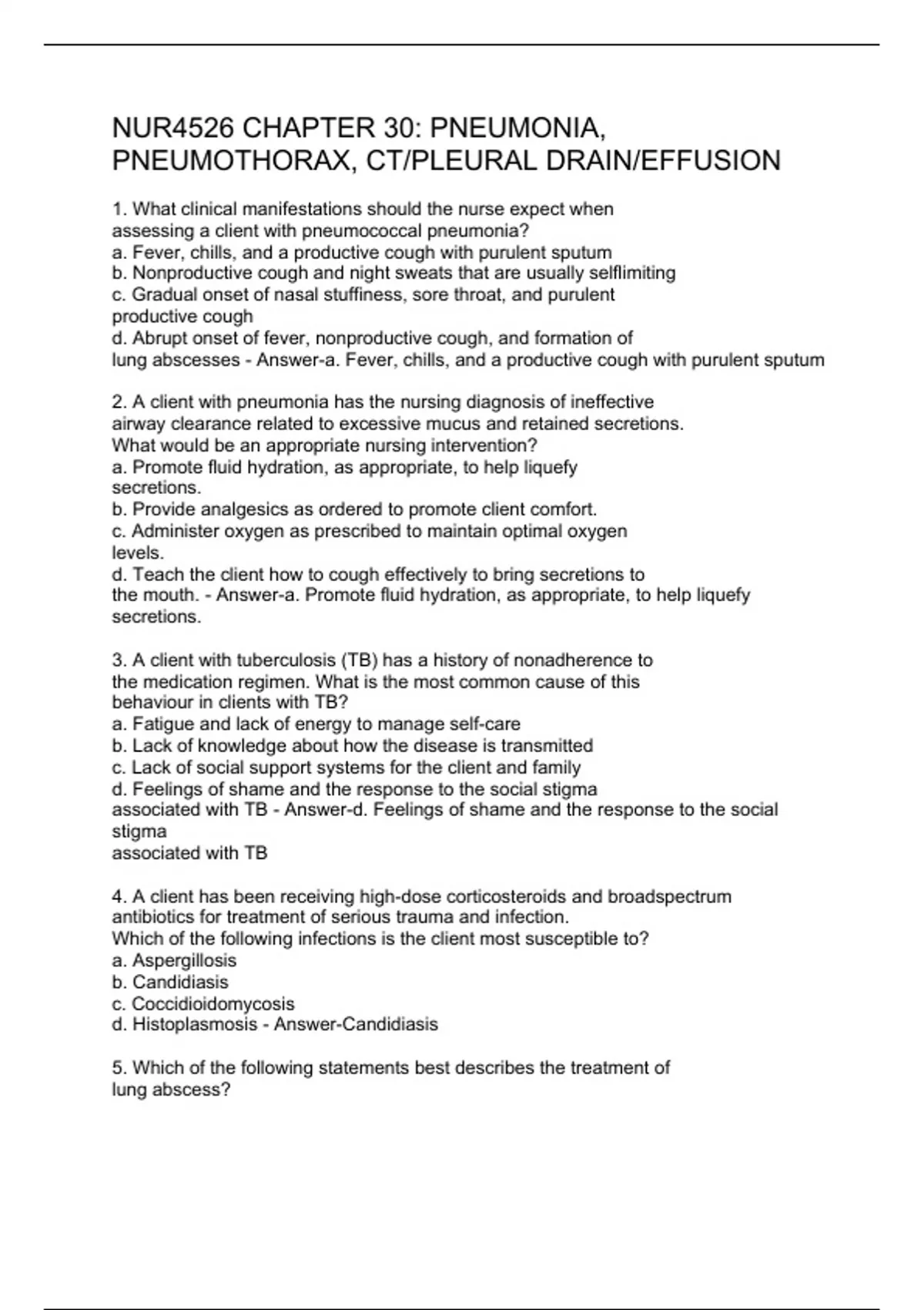 1. What clinical manifestations should the nurse expect when assessing a client with pneumococcal pneumonia? a. Fever, chills, and a productive cough with purulent sputum b. Nonproductive cough and night sweats that are usually selflimiting c. Gradual onset of nasal stuffiness, sore throat, and purulent productive cough d. Abrupt onset of fever, nonproductive cough, and formation of lung abscesses - Answer-a. Fever, chills, and a productive cough with purulent sputum 2. A client with pneumonia has the nursing diagnosis of ineffective airway clearance related to excessive mucus and retained secretions. What would be an appropriate nursing intervention? a. Promote fluid hydration, as appropriate, to help liquefy secretions. b. Provide analgesics as ordered to promote client comfort. c. Administer oxygen as prescribed to maintain optimal oxygen levels. d. Teach the client how to cough effectively to bring secretions to the mouth. - Answer-a. Promote fluid hydration, as appropriate, to help liquefy secretions. 3. A client with tuberculosis (TB) has a history of nonadherence to the medication regimen. What is the most common cause of this behaviour in clients with TB? a. Fatigue and lack of energy to manage self-care b. Lack of knowledge about how the disease is transmitted c. Lack of social support systems for the client and family d. Feelings of shame and the response to the social stigma associated with TB - Answer-d. Feelings of shame and the response to the social stigma associated with TB 4. A client has been receiving high-dose corticosteroids and broadspectrum antibiotics for treatment of serious trauma and infection. Which of the following infections is the client most susceptible to? a. Aspergillosis b. Candidiasis c. Coccidioidomycosis d. Histoplasmosis - Answer-Candidiasis 5. Which of the following statements best describes the treatment of lung abs