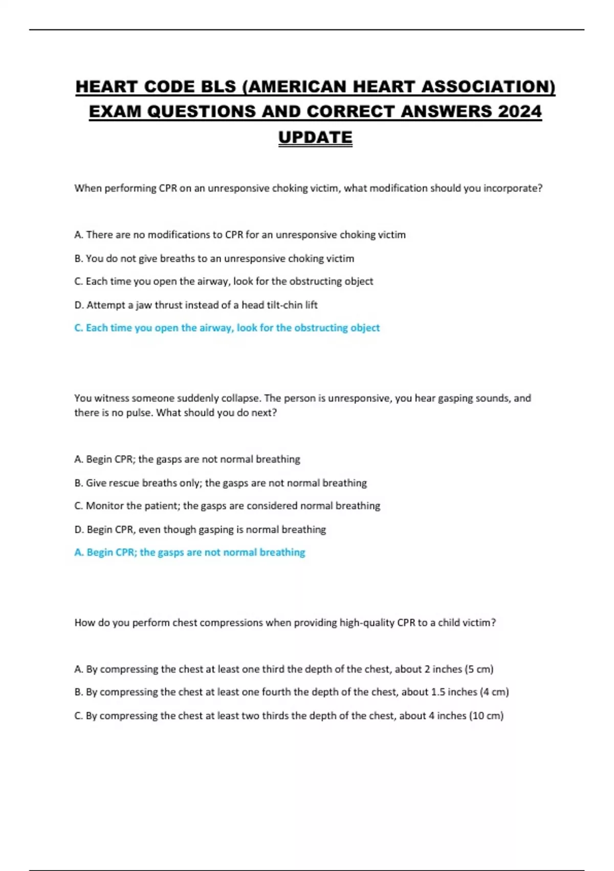 HEART CODE BLS (AMERICAN HEART ASSOCIATION) EXAM QUESTIONS AND CORRECT ANSWERS 2024 UPDATE