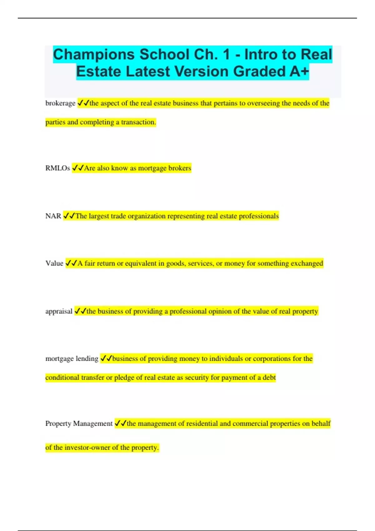 Champions School Ch. 1 - Intro to Real Estate Latest Version Graded A+ brokerage the aspect of the real estate business that pertains to overseeing the needs of the parties and completing a transaction. RMLOs Are also know as mortgage brokers NAR The largest trade organization representing real estate professionals Value A fair return or equivalent in goods, services, or money for something exchanged appraisal the business of providing a professional opinion of the value of real property mortgage lending business of providing money to individuals or corporations for the conditional transfer or pledge of real estate as security for payment of a debt Property Management the management of residential and commercial properties on behalf of the investor-owner of the property. Apartment Locators work for firms that specialize in locating units for tenants in multi- family complexes Apartment Locators. License or no license? license Home Inspectors licensed in Texas by the Texas Real Estate Commission (TREC). The inspector- candidate must complete a series of courses and pass the state exam Real Estate Development most often involves the acquisition of land for development into residential subdivisions, retail centers and other commercial uses. Oil & Gas Companies employ a large number of individuals with a real estate background Institute of Real Estate Management (IREM) An international community of real estate managers dedicated to ethical business practices, maximizing the value of investment real estate, and promoting superior management through education and information sharing. CCIM Institute Established in 1954 to give commercial real estate practitioners an opportunity to further their business practices through education and networking opportunities. Society of Industrial and Office Realtors (SIOR) a