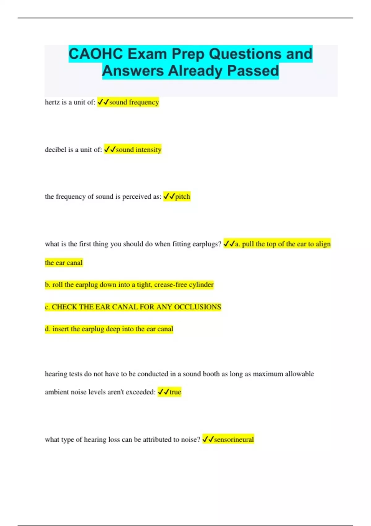 CAOHC Exam Prep Questions and Answers Already Passed hertz is a unit of: sound frequency decibel is a unit of: sound intensity the frequency of sound is perceived as: pitch what is the first thing you should do when fitting earplugs? a. pull the top of the ear to align the ear canal b. roll the earplug down into a tight, crease-free cylinder c. CHECK THE EAR CANAL FOR ANY OCCLUSIONS d. insert the earplug deep into the ear canal hearing tests do not have to be conducted in a sound booth as long as maximum allowable ambient noise levels aren't exceeded: true what type of hearing loss can be attributed to noise? sensorineural what is the frequency range of speech sounds? 250-4000 Hz OSHA requires exhaustive calibration if there is a deviation of greater than or equal to 15 dB: true the range of normal hearing is: 0-25 dB intermittent noise is noise that: a. does not end b. FLUCTUATES IN SOUND LEVEL WITH PERIODIC INTERRUPTIONS OF RELATIVE QUIET c. rises continuously d. has been abated through the implementation of engineering controls e. none of the above functional hearing loss is also known as pseudohypacusis: true conventional earplugs typically reduce high frequency noise more than low-frequency noise: true OSHA allows retests to be substituted for original tests if done within how many days of the original test? 30 days administrative controls to limit noise exposure to include: limiting the time a worker spends at a noise source when a worker's exposure level reaches the "action level", the employer must: include the worker in a hearing conservation program what components does OSHA require for worker training? a: effects of noise on hearing b: purpose of hearing protectors c: purpose of hearing testing d: instructions on selecting and fitting protectors e. ALL OF THE ABOVE what is the document that OSHA requires to report hearing loss incidents? form 300 the missions of CAOHC include: guiding industry on successful implementation of hearing conservation programs NIHL typically affects: higher frequencies first what is the term for temporary hearing loss after noise exposure? temporary threshold shift which of the following is NOT an occupational noise regulatory body? a. FRA b: MSHA C: CDC d: OSHA e: NIOSH in order to apply age correction to STS calculations,