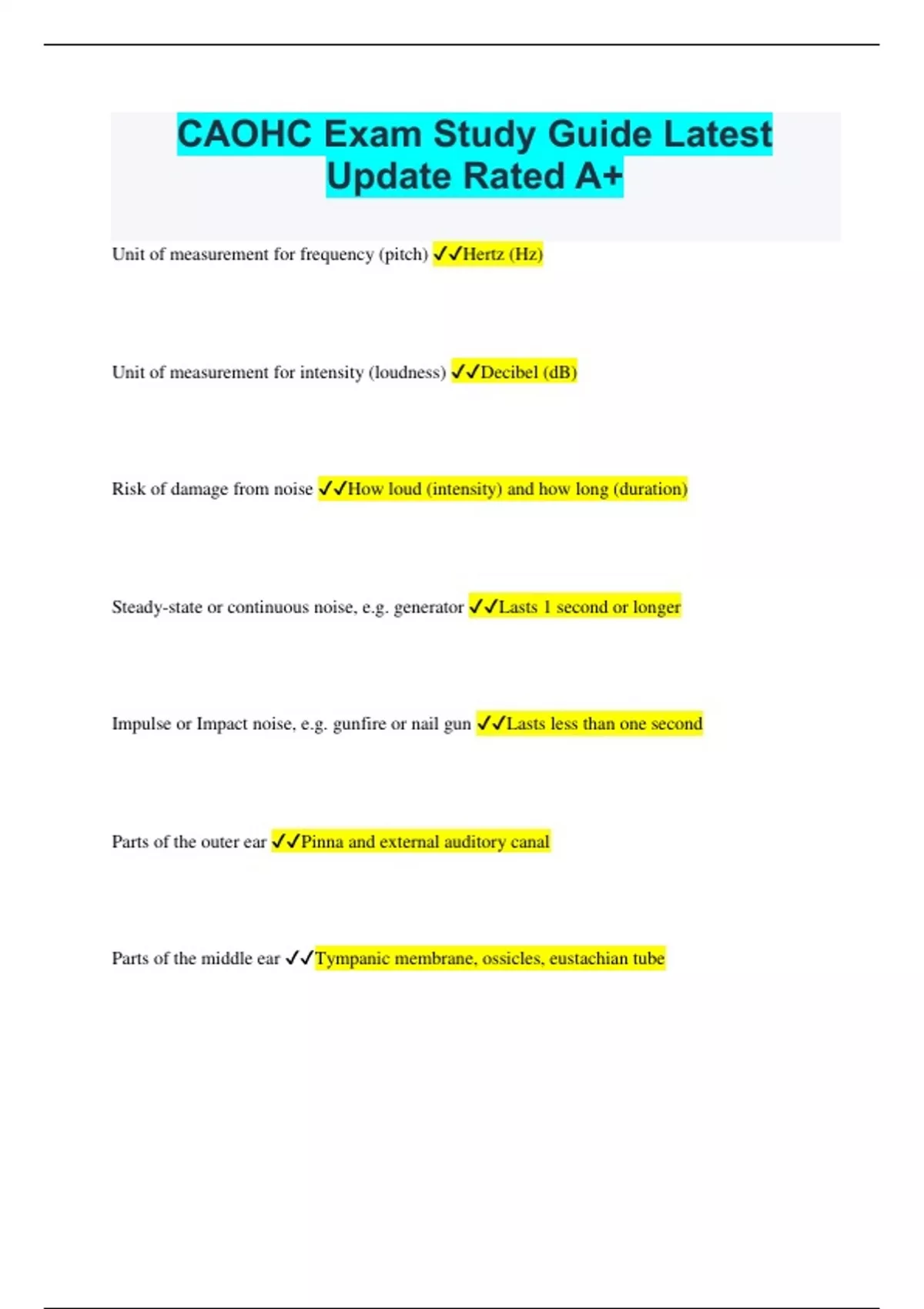 CAOHC Exam Study Guide Latest Update Rated A+ Unit of measurement for frequency (pitch) Hertz (Hz) Unit of measurement for intensity (loudness) Decibel (dB) Risk of damage from noise How loud (intensity) and how long (duration) Steady-state or continuous noise, e.g. generator Lasts 1 second or longer Impulse or Impact noise, e.g. gunfire or nail gun Lasts less than one second Parts of the outer ear Pinna and external auditory canal Parts of the middle ear Tympanic membrane, ossicles, eustachian tube Eustachian tube (auditory tube) Tube connecting the middle ear to the pharynx and equalizes middle ear space with atmospheric pressure Conductive HL occurs here Outer or middle ear Sensorineural hearing loss Hearing loss resulting from damage to the inner ear (cochlea) or the auditory nerve Noise-induced hearing loss (NIHL) Condition caused by the destruction of hair cells, the organs responsible for hearing, as a result of sounds that are "too long, too loud, or too close"; a sensorineural hearing loss Mixed hearing loss Combination of conductive and sensorineural types in the same ear Middle ear bones (ossicles) Malleus (hammer), incus (anvil), stapes (stirrup) Possible early symptoms/signs of noise induced hearing loss Tinnitus; difficulty understanding in presence of background noise; read visual cues Auditory effects of noise NIHL; tinnitus; hyperacusis Non-auditory effects of noise annoyance sleep disturbance attention motivation stress reactions cardiovascular problems endocrine problems 3 foot rule Good rule of thumb to recognize hazardous noise exposure levels/situations: the rule is: if you have to shout at arms length (~3ft), in order to be understood over the background noise, then you're likely exposed to hazardous noise levels & should be wearing hearing protection to prevent NIHL OSHA (Occupational Safety and Health Administration) versus National institute of Occupational Safety and Heath (NIOSH) OSHA enforces regulation and NIOSH recommends best practice based on science and research Sound pressure level (SPL) versus hearing level (HL) SPL describes noise measurements taken with a sound level meter or dosimeter; HL describes Threshold levels obtained with an audiometer; 0 dB HL is not equal to 0 dB SPL Noise Dosimeter A sound measurement device used to record the amount of sound exposure over an extended period of time (usually a work day) Personal vs. Area