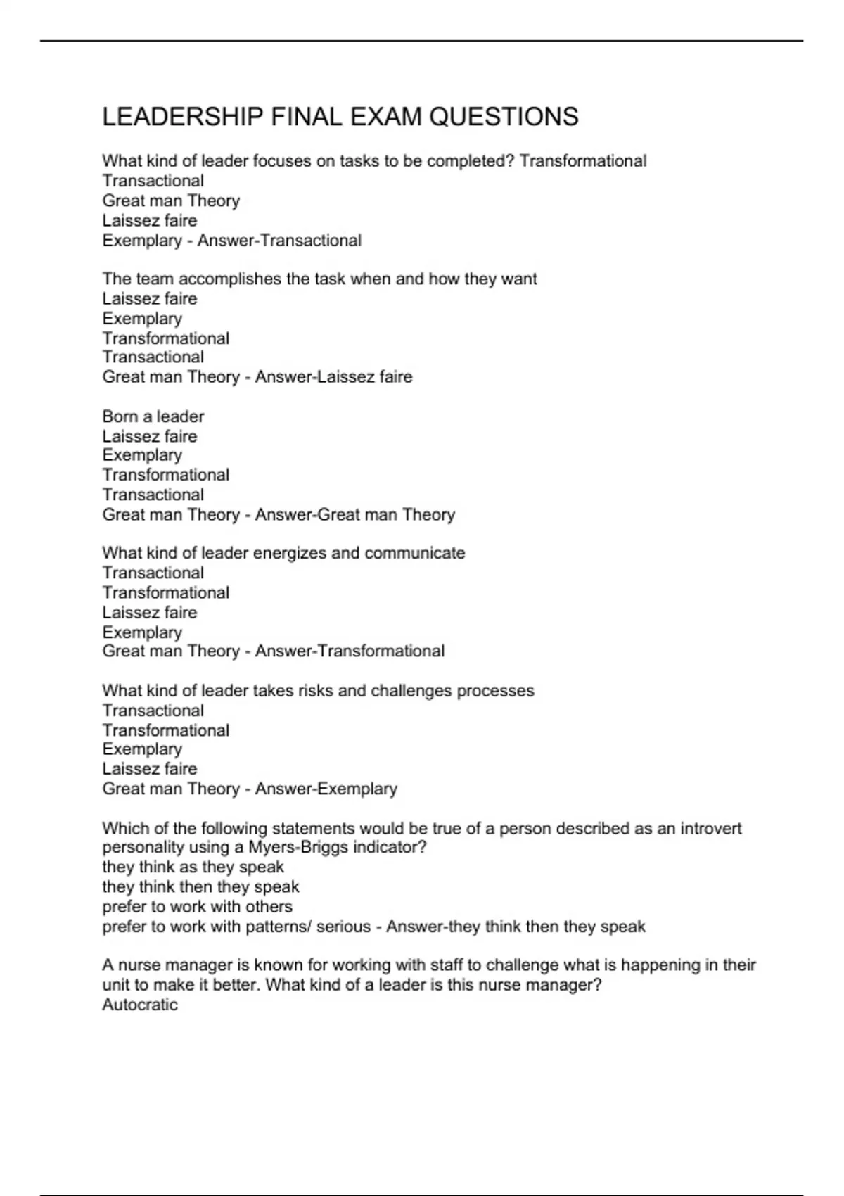 What kind of leader focuses on tasks to be completed? Transformational Transactional Great man Theory Laissez faire Exemplary - Answer-Transactional The team accomplishes the task when and how they want Laissez faire Exemplary Transformational Transactional Great man Theory - Answer-Laissez faire Born a leader Laissez faire Exemplary Transformational Transactional Great man Theory - Answer-Great man Theory What kind of leader energizes and communicate Transactional Transformational Laissez faire Exemplary Great man Theory - Answer-Transformational What kind of leader takes risks and challenges processes Transactional Transformational Exemplary Laissez faire Great man Theory - Answer-Exemplary Which of the following statements would be true of a person described as an introvert personality using a Myers-Briggs indicator? they think as they speak they think then they speak prefer to work with others prefer to work with patterns/ serious - Answer-they think then they speak