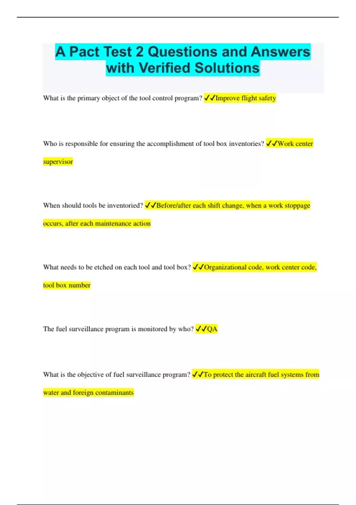 A Pact Test 2 Questions and Answers with Verified Solutions What is the primary object of the tool control program? Improve flight safety Who is responsible for ensuring the accomplishment of tool box inventories? Work center supervisor When should tools be inventoried? Before/after each shift change, when a work stoppage occurs, after each maintenance action What needs to be etched on each tool and tool box? Organizational code, work center code, tool box number The fuel surveillance program is monitored by who? QA What is the objective of fuel surveillance program? To protect the aircraft fuel systems from water and foreign contaminants What is the purpose of the oil consumption program Establish policy, responsibilities and requirements for monitoring aircraft equipment condition in a effort to detect impending failures without removal or extensive disassembly According to the hydraulic contamination control program, what is the highest and lowest contamination level for support equipment Navy standard class 3 You should handle tires and wheels with the same care as that given to live ordinance True FOD stands for Foreign object damage The best method for preventing FOD is strict compliance with FOD prevention program All FOD hazards cases should be reported to Maintenance/ production control, work center supervisor When working on aircraft or equipment, all ________ and ________ must be accounted for Hardware and tools During flight operations and the vicinity of operating aircraft engines, it is prohibited to Wear hats or other loose articles of clothing, eat/drink or smoke on the flight deck/flight line, carry magazines/rags/papers or other loose gear Who performs an inventory of aircraft and report shortages for inclusions in the aircraft inventory record Material control