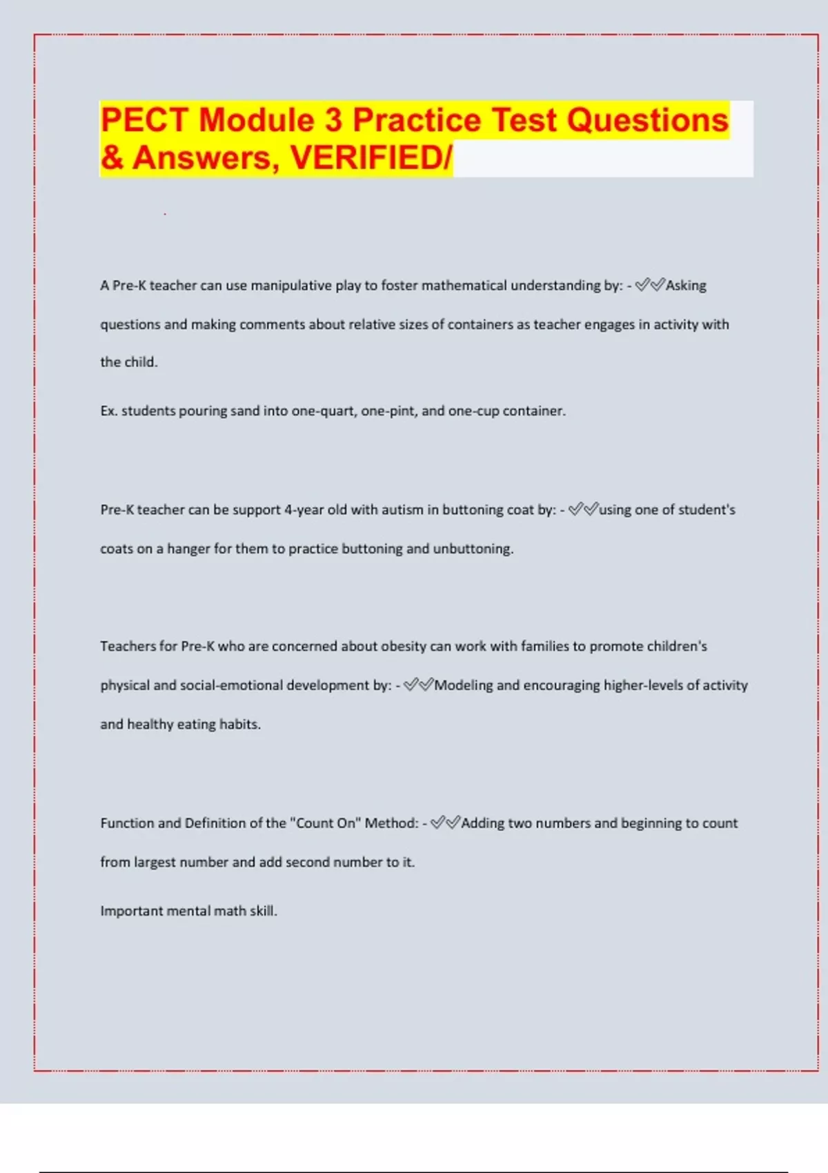 PECT Module 3 Practice Test Questions & Answers, VERIFIED/ A Pre-K teacher can use manipulative play to foster mathematical understanding by: - Asking questions and making comments about relative sizes of containers as teacher engages in activity with the child. Ex. students pouring sand into one-quart, one-pint, and one-cup container. Pre-K teacher can be support 4-year old with autism in buttoning coat by: - using one of student's coats on a hanger for them to practice buttoning and unbuttoning. Teachers for Pre-K who are concerned about obesity can work with families to promote children's physical and social-emotional development by: - Modeling and encouraging higher-levels of activity and healthy eating habits. Function and Definition of the "Count On" Method: - Adding two numbers and beginning to count from largest number and add second number to it. Important mental math skill. A third-grader who has solved a problem correctly but doesn't show work can show conceptual understanding of problem by: - Explaining the steps to arrive at the answer. Placing white carnation in dark blue water until carnation turns blue models: - Nutrient Absorption. Pre-K Counts sends food and supplies to: - -Children from families with less than 300% income eligibility according to guidelines -Children between 3 and younger-then kindergarten -Children who are at risk of school failure because of ELL concerns or special needs. Activity for kindergartners to decompose number ten into number pairs: - Using number cubes to show how to make ten in more than one wa