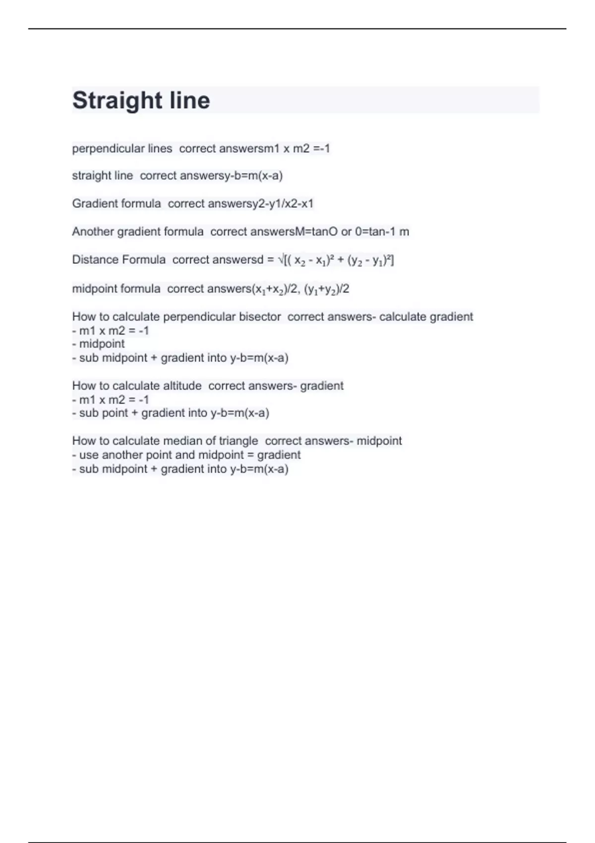 perpendicular lines correct answersm1 x m2 =-1 straight line correct answersy-b=m(x-a) Gradient formula correct answersy2-y1/x2-x1 Another gradient formula correct answersM=tanO or 0=tan-1 m Distance Formula correct answersd = √[( x₂ - x₁)² + (y₂ - y₁)²] midpoint formula correct answers(x₁+x₂)/2, (y₁+y₂)/2 How to calculate perpendicular bisector correct answers- calculate gradient - m1 x m2 = -1