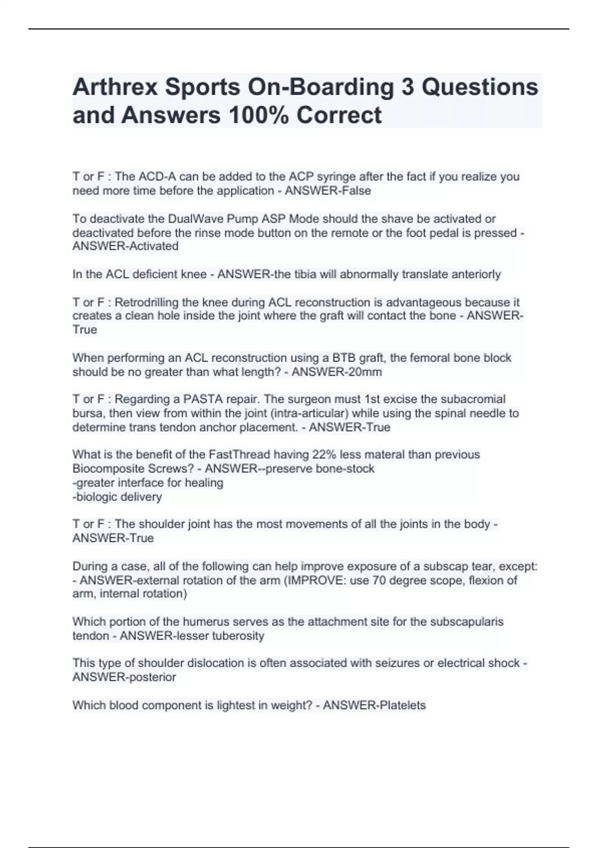 Arthrex Sports On-Boarding 3 Questions and Answers 100% Correct Arthrex Sports On-Boarding 3 Questions and Answers 100% Correct Arthrex Sports On-Boarding 3 Questions and Answers 100% Correct Arthrex Sports On-Boarding 3 Questions and Answers 100% Correct T or F : The ACD-A can be added to the ACP syringe after the fact if you realize you need more time before the application - ANSWER-False To deactivate the DualWave Pump ASP Mode should the shave be activated or deactivated before the rinse mode button on the remote or the foot pedal is pressed - ANSWER-Activated In the ACL deficient knee - ANSWER-the tibia will abnormally translate anteriorly T or F : Retrodrilling the knee during ACL reconstruction is advantageous because it creates a clean hole inside the joint where the graft will contact the bone - ANSWER-True