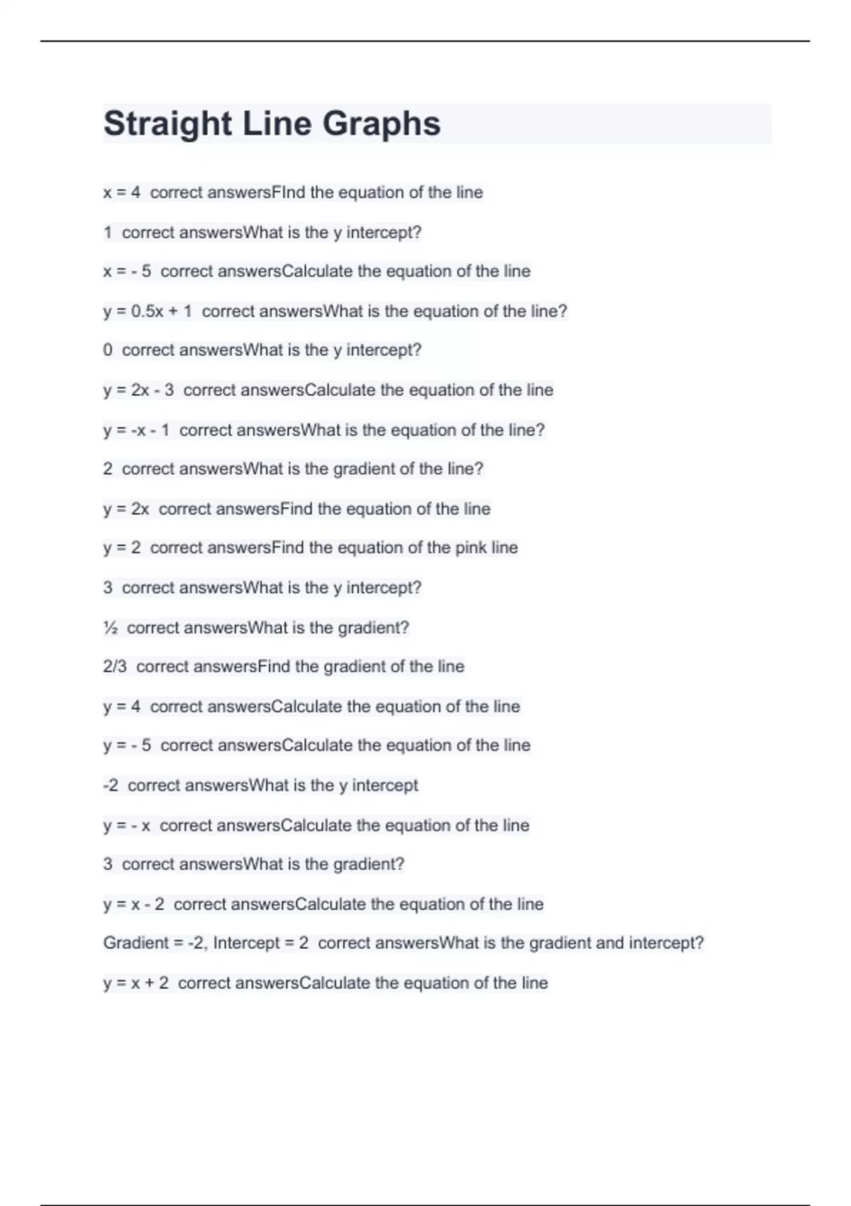 x = 4 correct answersFInd the equation of the line 1 correct answersWhat is the y intercept? x = - 5 correct answersCalculate the equation of the line y = 0.5x + 1 correct answersWhat is the equation of the line? 0 correct answersWhat is the y intercept? y = 2x - 3 correct answersCalculate the equation of the line y = -x - 1 correct answersWhat is the equation of the line? 2 correct answersWhat is the gradient of the line? y = 2x correct answersFind the equation of the line y = 2 correct answersFind the equation of the pink line 3 correct answersWhat is the y intercept? ½ correct answersWhat is the gradient? 2/3 correct answersFind the gradient of the line y = 4 correct answersCalculate the equation of the line y = - 5 correct answersCalculate the equation of the line -2 correct answersWhat is the y intercept