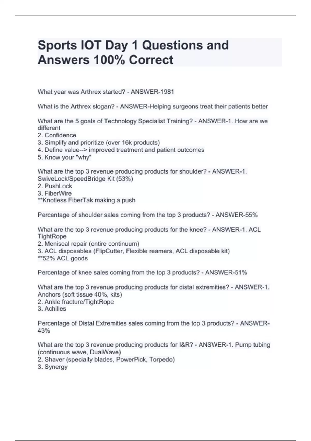 Sports IOT Day 1 Questions and Answers 100% Correct Sports IOT Day 1 Questions and Answers 100% Correct Sports IOT Day 1 Questions and Answers 100% Correct Sports IOT Day 1 Questions and Answers 100% Correct Sports IOT Day 1 Questions and Answers 100% Correct What year was Arthrex started? - ANSWER-1981 What is the Arthrex slogan? - ANSWER-Helping surgeons treat their patients better What are the 5 goals of Technology Specialist Training? - ANSWER-1. How are we different 2. Confidence