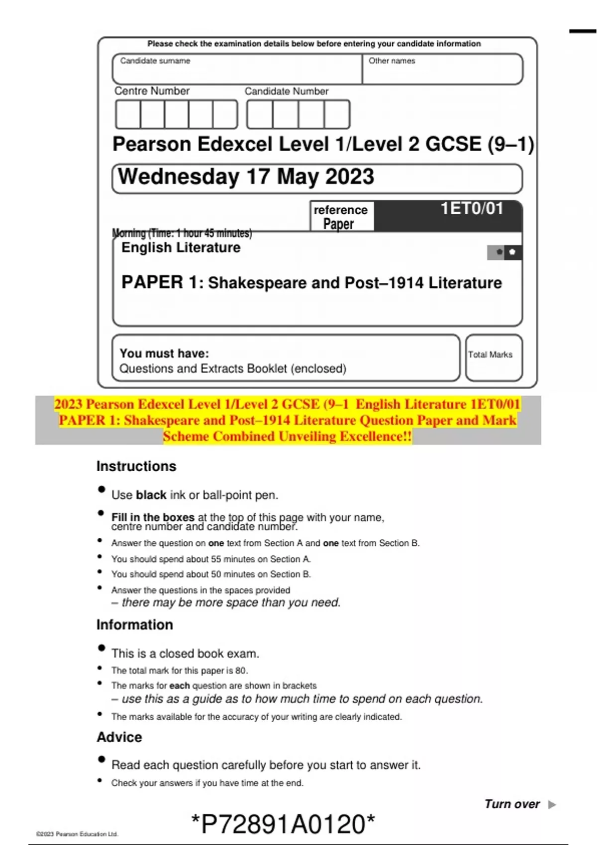 2023 Pearson Edexcel Level 1/Level 2 GCSE (9–1 English Literature 1ET0/01 PAPER 1: Shakespeare and Post–1914 Literature Question Paper and Mark Scheme Combined Unveiling Excellence!!