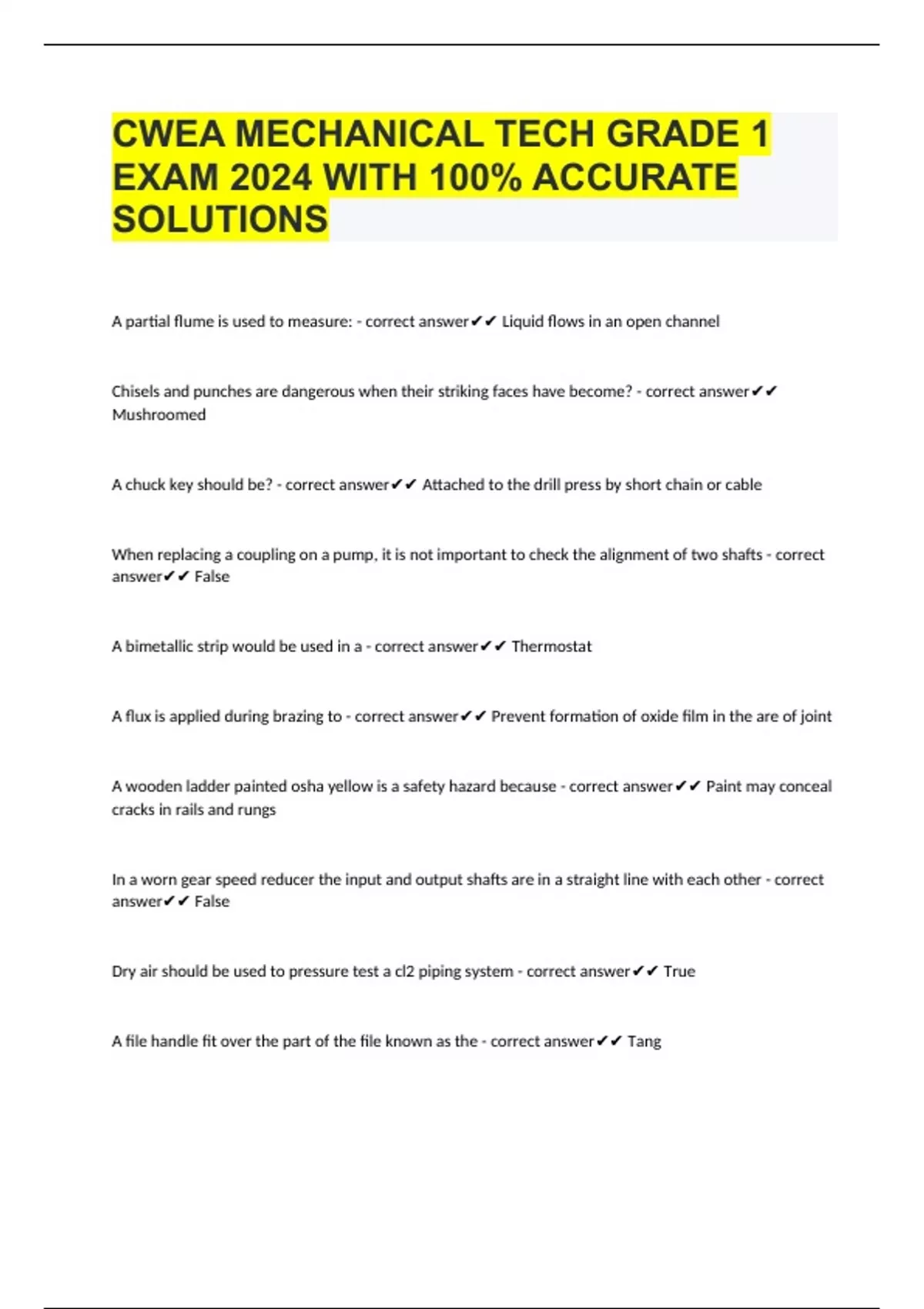 CWEA MECHANICAL TECH GRADE 1 EXAM 2024 WITH 100% ACCURATE SOLUTIONS A partial flume is used to measure: - correct answer Liquid flows in an open channel Chisels and punches are dangerous when their striking faces have become? - correct answer Mushroomed A chuck key should be? - correct answer Attached to the drill press by short chain or cable When replacing a coupling on a pump, it is not important to check the alignment of two shafts - correct answer False A bimetallic strip would be used in a - correct answer Thermostat A flux is applied during brazing to - correct answer Prevent formation of oxide film in the are of joint A wooden ladder painted osha yellow is a safety hazard because - correct answer Paint may conceal cracks in rails and rungs In a worn gear speed reducer the input and output shafts are in a straight line with each other - correct answer False Dry air should be used to pressure test a cl2 piping system - correct answer True A file h