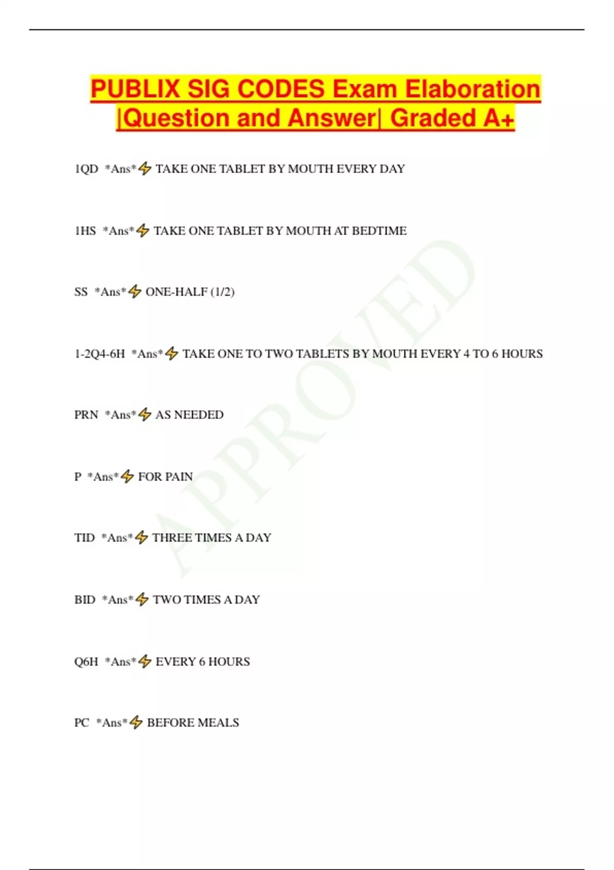 PUBLIX SIG CODES Exam Elaboration |Question and Answer| Graded A+ 1QD *Ans* TAKE ONE TABLET BY MOUTH EVERY DAY 1HS *Ans* TAKE ONE TABLET BY MOUTH AT BEDTIME SS *Ans* ONE-HALF (1/2) 1-2Q4-6H *Ans* TAKE ONE TO TWO TABLETS BY MOUTH EVERY 4 TO 6 HOURS PRN *Ans* AS NEEDED P *Ans* FOR PAIN TID *Ans* THREE TIMES A DAY BID *Ans* TWO TIMES A DAY Q6H *Ans* EVERY 6 HOURS PC *Ans* BEFORE MEALS AC *Ans* AFTER MEAL 1QOD *Ans* TAKE ONE TABLET BY MOUTH EVERY OTHER DAY 1QW *Ans* TAKE ONE TABLET BY MOUTH EVERY WEEK 1QAM *Ans* TAKE ONE TABLET BY MOUTH EVERY MORNING 1TSPBID X10 *Ans* TAKE ONE TEASPOONFUL (5ML) BY MOUTH TWICE DAILY FOR 10 DAYS X5 *Ans* FOR 5 DAYS (X1, X2, X3, X4 DAYS ETC.