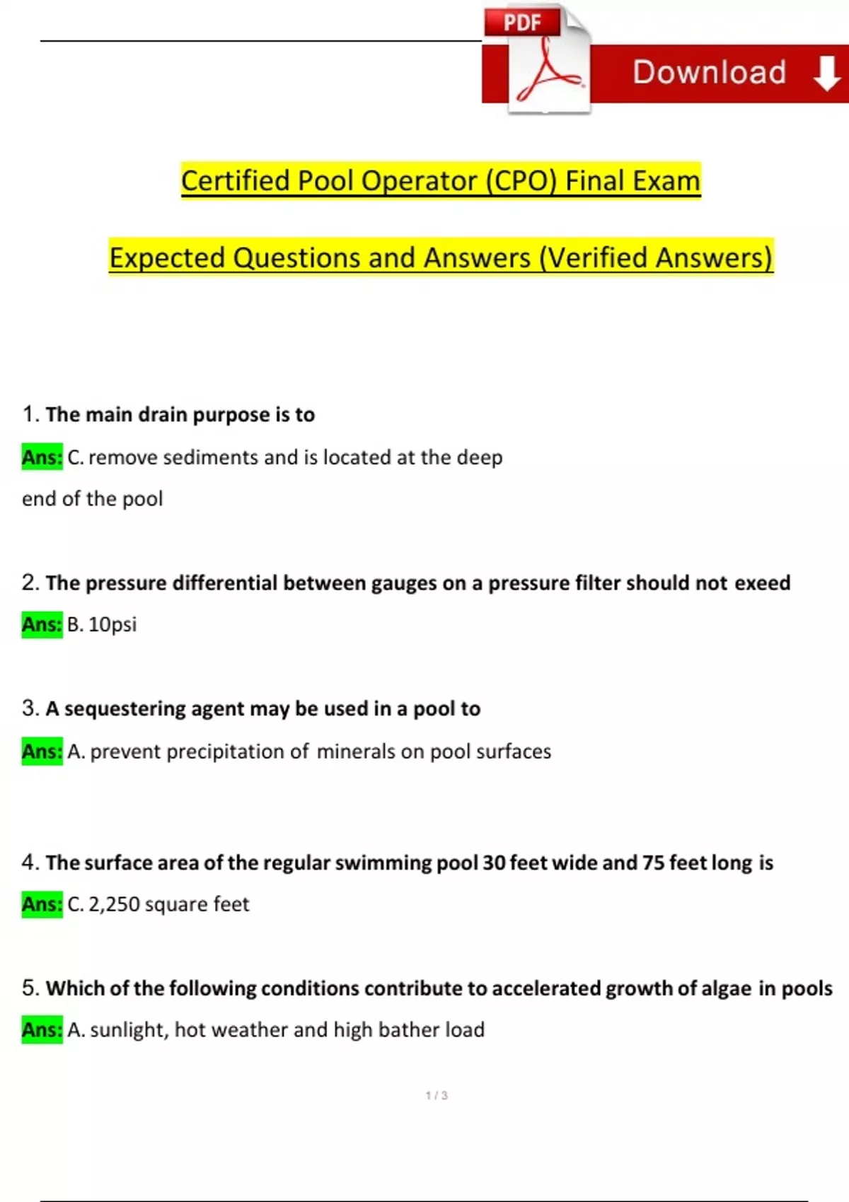 Certified Pool Operator Exam Study Guide Questions and Answers (2024 / 2025) (Verified Answers) Certified Pool Operator Final Exam 2024 / 2025 Expected Questions and Answers (Verified Answers) Certified Pool Operator Test 2024 / 2025 Expected Questions and Answers (Verified Answers) Cpo test 2024 questions and answers pdf Cpo test 2024 questions and answers free CPO exam questions Free certified pool operator test 2024 Certified pool operator test 2024 pdf Certified pool operator test 2024 texas CPO test questions and answers Free CPO Certification online CPO test questions and answers PDF CPO cheat sheet Certified Pool Operator exam Free certified pool operator cpo test Certified pool operator cpo test questions Certified pool operator cpo test pdf Certified pool operator cpo test quizlet CPO test questions and answers Certified pool operator cpo test answers Free CPO Certification online CPO Certification cost Free CPO test questions and answers PDF Free CPO test answers 2023 CPO cheat sheet CPO practice test quizlet CPO practice test 2023 Free CPO test answers 2024 Is the CPO test hard Free CPO practice test Question 1: What is the ideal pH level for a swimming pool? Question 2: Which of the following is not a primary function of chlorine in pool water? Question 3: What is the main purpose of backwashing a pool filter? Question 4: Which factor does not affect the balance of pool water? CPO test questions and answers Cpo practice test quizlet pdf Free cpo practice test quizlet CPO test questions and answers PDF Free CPO test answers 2023 CPO cheat sheet Cpo practice test quizlet 2020 Free CPO practice test