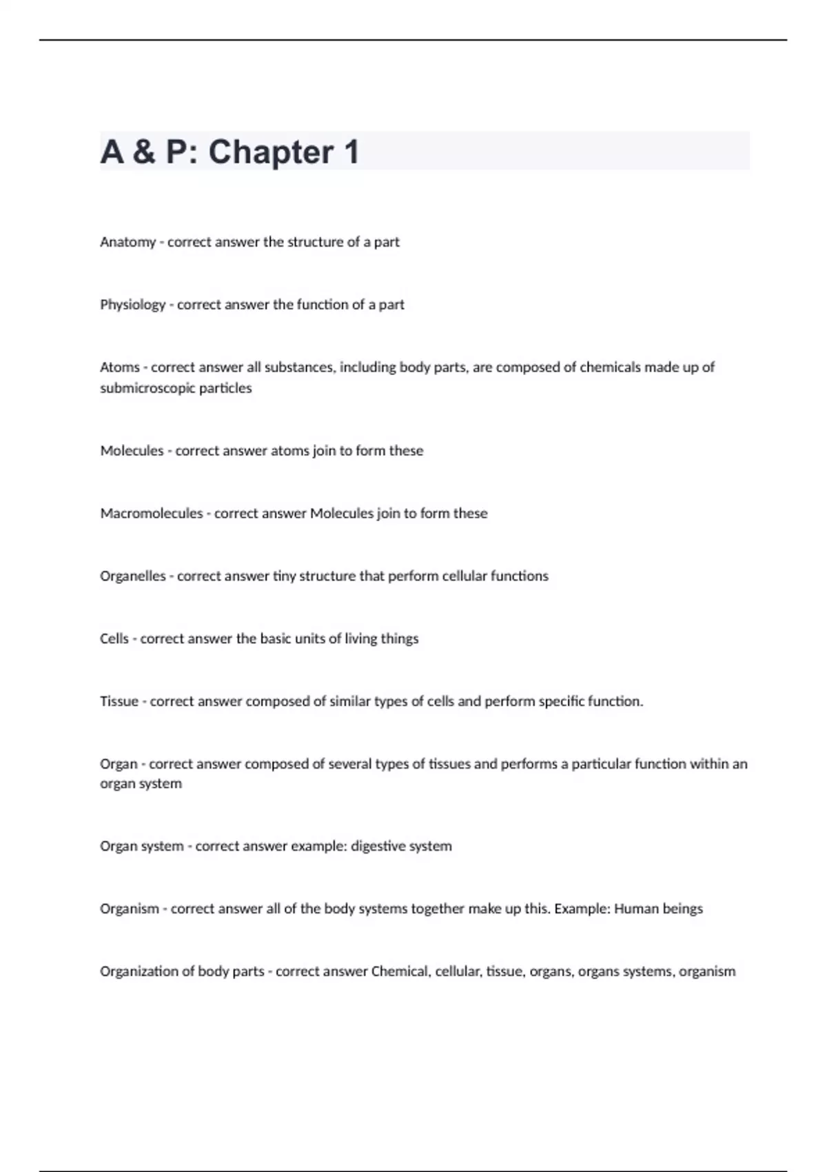 A & P Chapter 1 Chamberlain College Nursing Questions with complete solution A & P: Chapter 1 Anatomy - correct answer the structure of a part Physiology - correct answer the function of a part Atoms - correct answer all substances, including body parts, are composed of chemicals made up of submicroscopic particles Molecules - correct answer atoms join to form these Macromolecules - correct answer Molecules join to form these Organelles - correct answer tiny structure that perform cellular functions Cells - correct answer the basic units of living things Tissue - correct answer composed of similar types of cells and perform specific function. Organ - correct answer composed of several types of tissues and performs a particular function within an organ system Organ system - correct answer example: digestive system Organism - correct answer all of the body systems together make up this. Example: Human beings