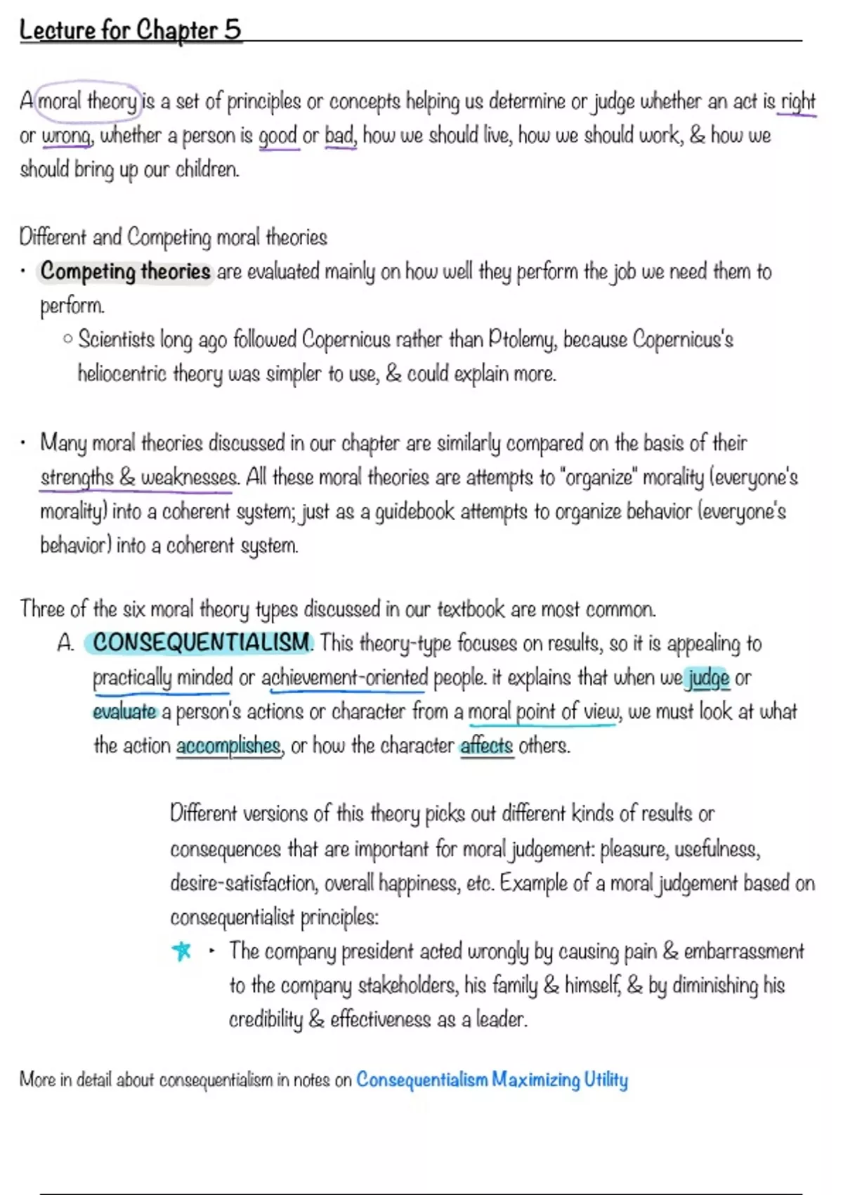 Written document on notes from Chapter 5 Moral Theories from the course PHIL 2275 Professional Ethics.