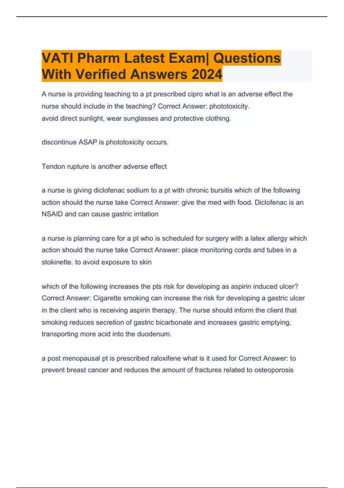 VATI Pharm Latest Exam| Questions With Verified Answers 2024 A nurse is providing teaching to a pt prescribed cipro what is an adverse effect the nurse should include in the teaching? Correct Answer: phototoxicity. avoid direct sunlight, wear sunglasses and protective clothing. discontinue ASAP is phototoxicity occurs. Tendon rupture is another adverse effect a nurse is giving diclofenac sodium to a pt with chronic bursitis which of the following action should the nurse take Correct Answer: give the med with food. Diclofenac is an NSAID and can cause gastric irritation a nurse is planning care for a pt who is scheduled for surgery with a latex allergy which action should the nurse take Correct Answer: place monitoring cords and tubes in a stokinette. to avoid exposure to skin which of the following increases the pts risk for developing as aspirin induced ulcer? Correct Answer: Cigarette smoking can increase the risk for developing a gastric ulcer in the client who is receiving aspirin therapy. The nurse should inform the client that smoking reduces secretion of gastric bicarbonate and increases gastric emptying, transporting more acid into the duodenum. a post menopausal pt is prescribed raloxifene what is it used for Correct Answer: to prevent breast cancer and reduces the amount of fractures related to osteoporosis a nurse is providing teaching to a pt with a hx of DM and has a new prescription for hydrochlorothiazide what should the nurse include in the teaching? Correct Answer: hydrochlorothiazide can elevate your blood sugar what should the nurse monitor for the pt taking acetazolamide Correct Answer: electrolyte imbalances. teaching for pt taking zidovudine Correct Answer: limit exposure to people who have infections. zidovudine is use to treat HIV, hep B and epstein barr allopurinol Correct Answer: decreases the production of uric acid increase fluid consumption while taking to prevent kidney injury