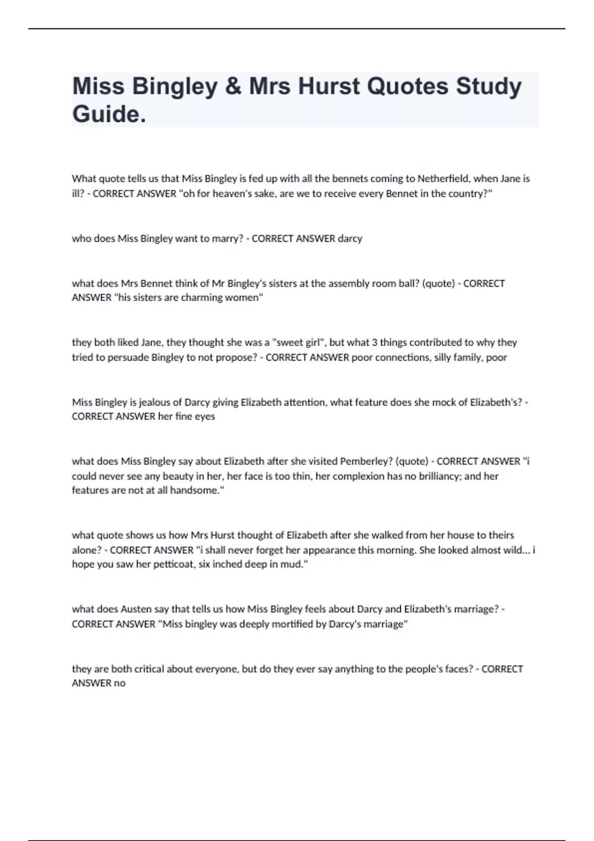 Miss Bingley & Mrs Hurst Quotes Practice Review Study Questions. What quote tells us that Miss Bingley is fed up with all the bennets coming to Netherfield, when Jane is ill? - CORRECT ANSWER "oh for heaven's sake, are we to receive every Bennet in the country?" who does Miss Bingley want to marry? - CORRECT ANSWER darcy what does Mrs Bennet think of Mr Bingley's sisters at the assembly room ball? (quote) - CORRECT ANSWER "his sisters are charming women" they both liked Jane, they thought she was a "sweet girl", but what 3 things contributed to why they tried to persuade Bingley to not propose? - CORRECT ANSWER poor connections, silly family, poor Miss Bingley is jealous of Darcy giving Elizabeth attention, what feature does she mock of Elizabeth's? - CORRECT ANSWER her fine eyes