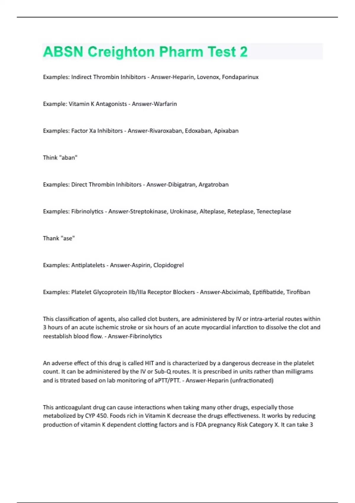 Examples: Indirect Thrombin Inhibitors - Answer-Heparin, Lovenox, Fondaparinux Example: Vitamin K Antagonists - Answer-Warfarin Examples: Factor Xa Inhibitors - Answer-Rivaroxaban, Edoxaban, Apixaban Think "aban" Examples: Direct Thrombin Inhibitors - Answer-Dibigatran, Argatroban Examples: Fibrinolytics - Answer-Streptokinase, Urokinase, Alteplase, Reteplase, Tenecteplase Thank "ase" Examples: Antiplatelets - Answer-Aspirin, Clopidogrel Examples: Platelet Glycoprotein IIb/IIIa Receptor Blockers - Answer-Abciximab, Eptifibatide, Tirofiban This classification of agents, also called clot busters, are administered by IV or intra-arterial routes within 3 hours of an acute ischemic stroke or six hours of an acute myocardial infarction to dissolve the clot and reestablish blood flow. - Answer-Fibrinolytics An adverse effect of this drug is called HIT and is characterized by a dangerous decrease in the platelet count. It can be administered by the IV or Sub-Q routes. It is prescribed in units rather than milligrams and is titrated based on lab monitoring of aPTT/PTT. - Answer-Heparin (unfractionated) This anticoagulant drug can cause interactions when taking many other drugs, especially those metabolized by CYP 450. Foods rich in Vitamin K decrease the drugs effectiveness. It works by reducing production of vitamin K dependent clotting factors and is FDA pregnancy Risk Category X. It can take 3days to reach its peak effect. Once in the blood, about 99% of this drug is bound to albumin. Lab monitoring with INR is used to monitor this drug. An INR of 2 to 3 is appropriate for most patients taking this drug, although for some patients the target INR is 3 to 4.5. The antidote for overdose is Vitamin K. - Answer-Warfarin This drug causes irreversible acetylation of cyclooxygenase which inhibits platelet aggregation and prolongs bleeding time. - Answer-Aspirin IV drugs in this classification of drugs inhibit thrombin without interacting with antithrombin and are generally used in coronary angioplasty and cardiopulmonary bypass in those who are unable to tolerate heparin. The oral (PO) drugs in this classification can be used in place of warfarin to prevent embolism in non-valvular atrial fibrillation. No therapeutic drug monitoring is required, reversal treatment is available, and there are lower bleeding rates compared with warfarin. - Answer-Direct Thrombin Inhibitors This drug is an injection that can be self-administered in the home. It can be given on a fixed dose without the need for routine monitoring of coagulation or in the hospital setting, it may be adjusted by weight. - Answer-Lovenox (LMW heparin) This antiplatelet drug inhibits platelet aggregation and can be used to prevent blockage of coronary artery stents. It is also used to prevent MI and stroke in patients with acute coronary syndrome - AnswerClopidogrel This classification of drugs, sometimes called super aspirins, are administered IV, and cause reversible blockade of platelet GP IIb/IIIa receptors. They are indicated short-term in acute coronary syndrome and coronary angioplasty and are frequently given in conjunction with aspirin and heparin. - Answer-Platelet Glycoprotein IIb/IIIa receptor blockers