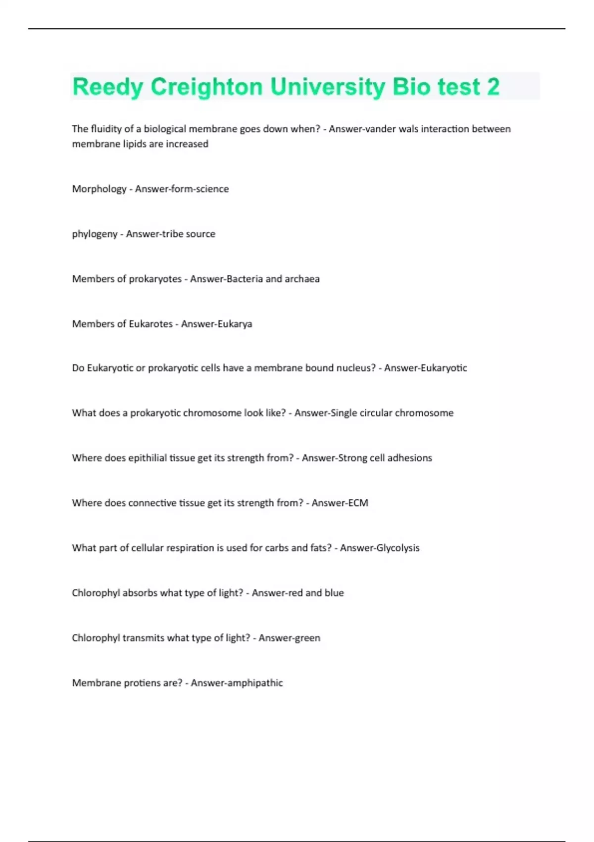 Reedy Creighton University Bio test 2 Questions and Answers with complete solution