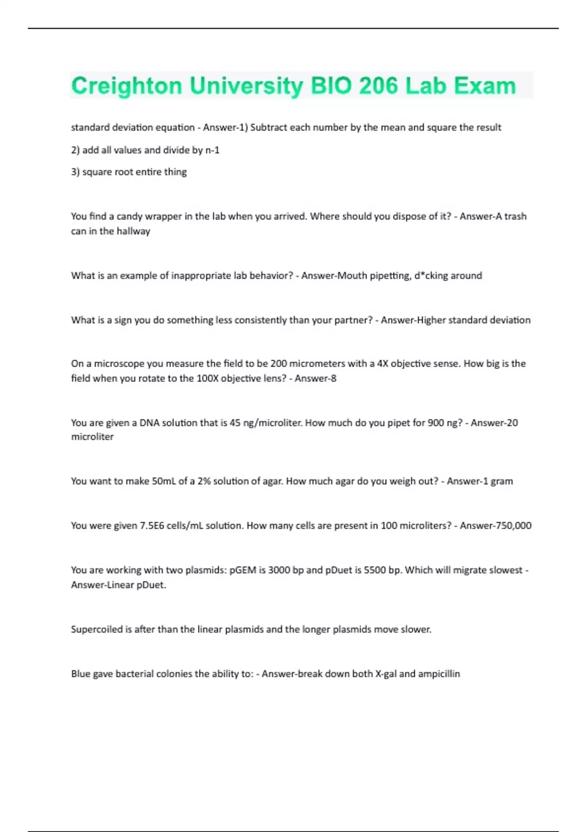 standard deviation equation - Answer-1) Subtract each number by the mean and square the result 2) add all values and divide by n-1 3) square root entire thing You find a candy wrapper in the lab when you arrived. Where should you dispose of it? - Answer-A trash can in the hallway What is an example of inappropriate lab behavior? - Answer-Mouth pipetting, d*cking around What is a sign you do something less consistently than your partner? - Answer-Higher standard deviation On a microscope you measure the field to be 200 micrometers with a 4X objective sense. How big is the field when you rotate to the 100X objective lens? - Answer-8 You are given a DNA solution that is 45 ng/microliter. How much do you pipet for 900 ng? - Answer-20 microliter You want to make 50mL of a 2% solution of agar. How much agar do you weigh out? - Answer-1 gram You were given 7.5E6 cells/mL solution. How many cells are present in 100 microliters? - Answer-750,000 You are working with two plasmids: pGEM is 3000 bp and pDuet is 5500 bp. Which will migrate slowest - Answer-Linear pDuet. Supercoiled is after than the linear plasmids and the longer plasmids move slower. Blue gave bacterial colonies the ability to: - Answer-break down both X-gal and ampicillinIn the amylase enzyme activity assays you performed, iodine was important because: - Answer-it is a colorimetric indicator that stained the product of the reaction. In a spectrophotometer, as % transmittance _______________, the amylase catalyzed the conversion of ____________ to __________ - Answer-increases; starch to maltose What affects the affinity of an enzyme for a substrate? - Answer-Hydrogen bonding van der Waals interactions shape and conformation Under normal conditions which of the following stages of C. elegans life cycle does not occur? - AnswerDauer