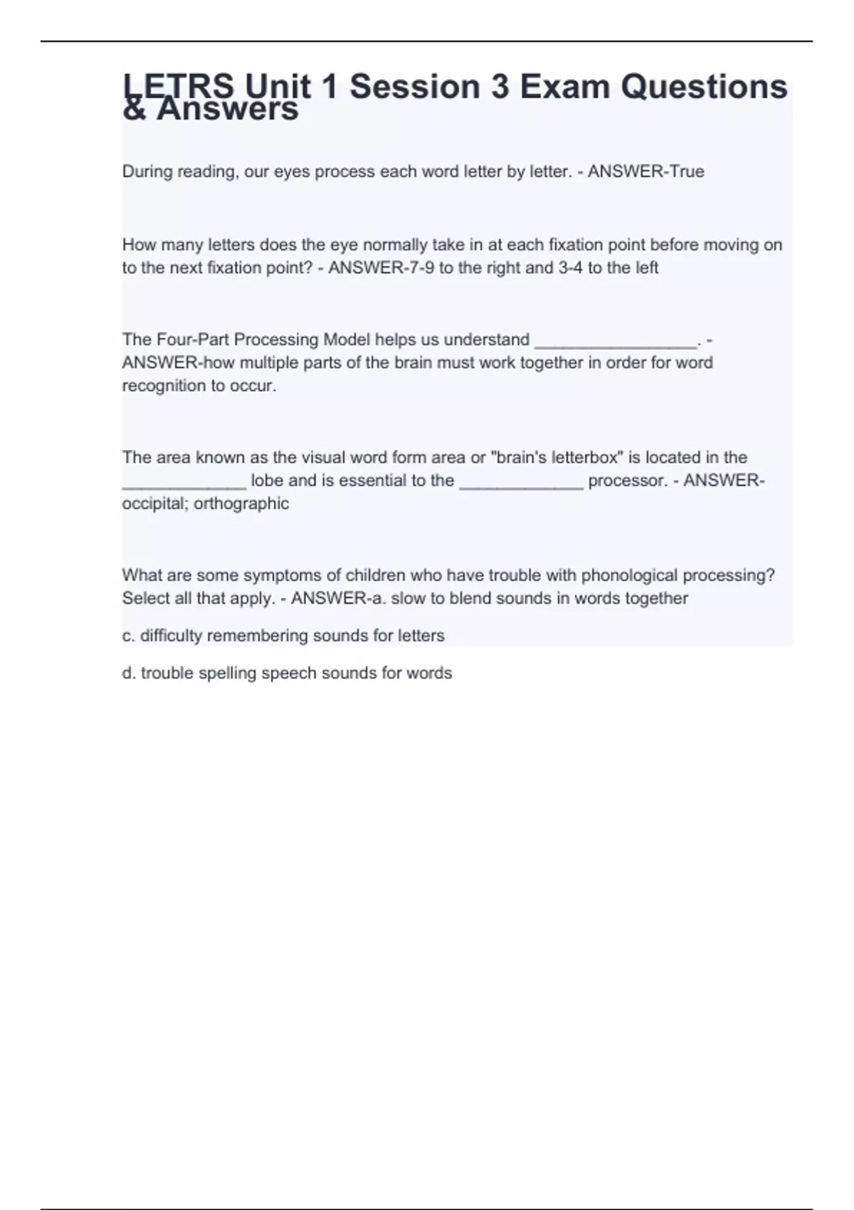 During reading, our eyes process each word letter by letter. - ANSWER-True How many letters does the eye normally take in at each fixation point before moving on to the next fixation point? - ANSWER-7-9 to the right and 3-4 to the left The Four-Part Processing Model helps us understand _________________. - ANSWER-how multiple parts of the brain must work together in order for word recognition to occur. The area known as the visual word form area or "brain's letterbox" is located in the _____________ lobe and is essential to the _____________ processor. - ANSWER-occipital; orthographic