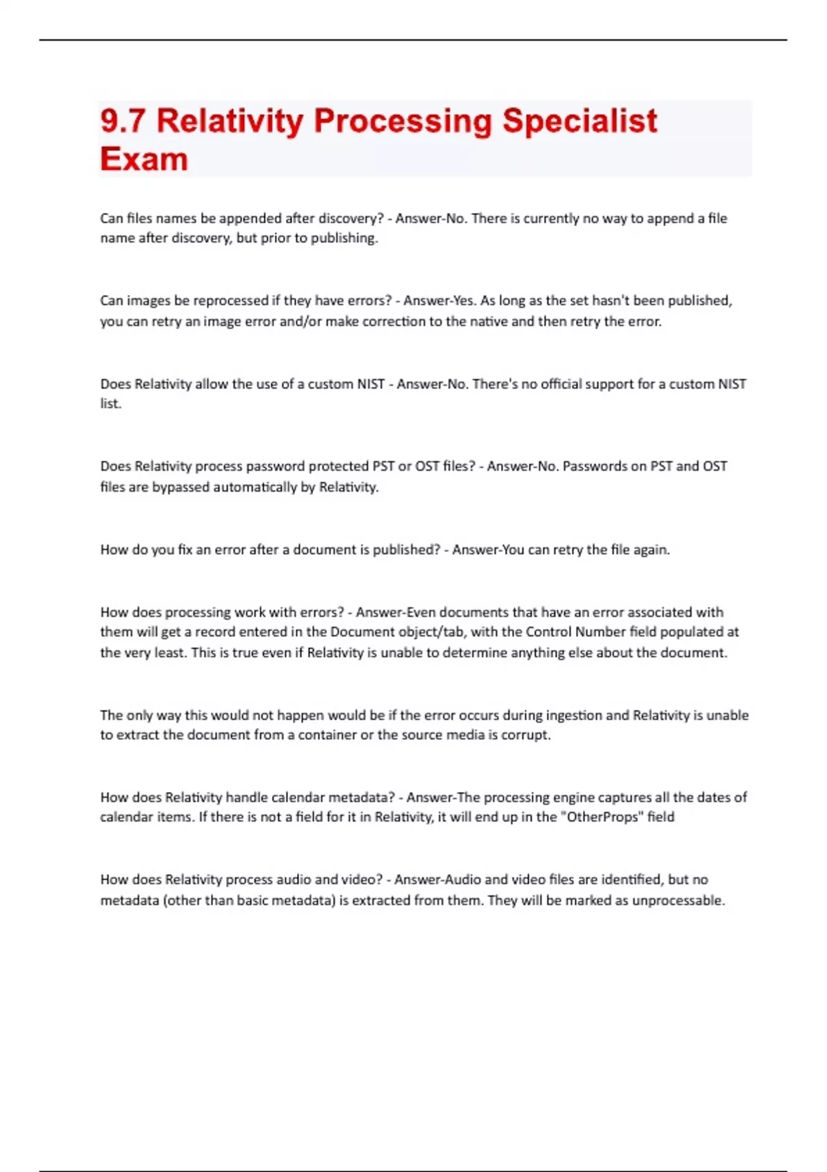 Can files names be appended after discovery? - Answer-No. There is currently no way to append a file name after discovery, but prior to publishing. Can images be reprocessed if they have errors? - Answer-Yes. As long as the set hasn't been published, you can retry an image error and/or make correction to the native and then retry the error. Does Relativity allow the use of a custom NIST - Answer-No. There's no official support for a custom NIST list. Does Relativity process password protected PST or OST files? - Answer-No. Passwords on PST and OST files are bypassed automatically by Relativity. How do you fix an error after a document is published? - Answer-You can retry the file again. How does processing work with errors? - Answer-Even documents that have an error associated with them will get a record entered in the Document object/tab, with the Control Number field populated at the very least. This is true even if Relativity is unable to determine anything else about the document. The only way this would not happen would be if the error occurs during ingestion and Relativity is unable to extract the document from a container or the source media is corrupt. How does Relativity handle calendar metadata? - Answer-The processing engine captures all the dates of calendar items. If there is not a field for it in Relativity, it will end up in the "OtherProps" field How does Relativity process audio and video? - Answer-Audio and video files are identified, but no metadata (other than basic metadata) is extracted from them. They will be marked as unprocessable.How does processing handle time zones? - Answer-Discovery is performed on all natives in UTC. The timeline defined in the processing set is then referenced to convert metadata dats and times into the selected timezone. Once files are published, are they deleted from the processing source location? - Answer-No. Relativity reads from this intermediate location and copies the files to the Relativity workspace file repository. What files display in the deNIST report? - Answer-The DeNIST report displays only attachments. Individual files can be viewed in the deNIST table at he INVXXXXX database.