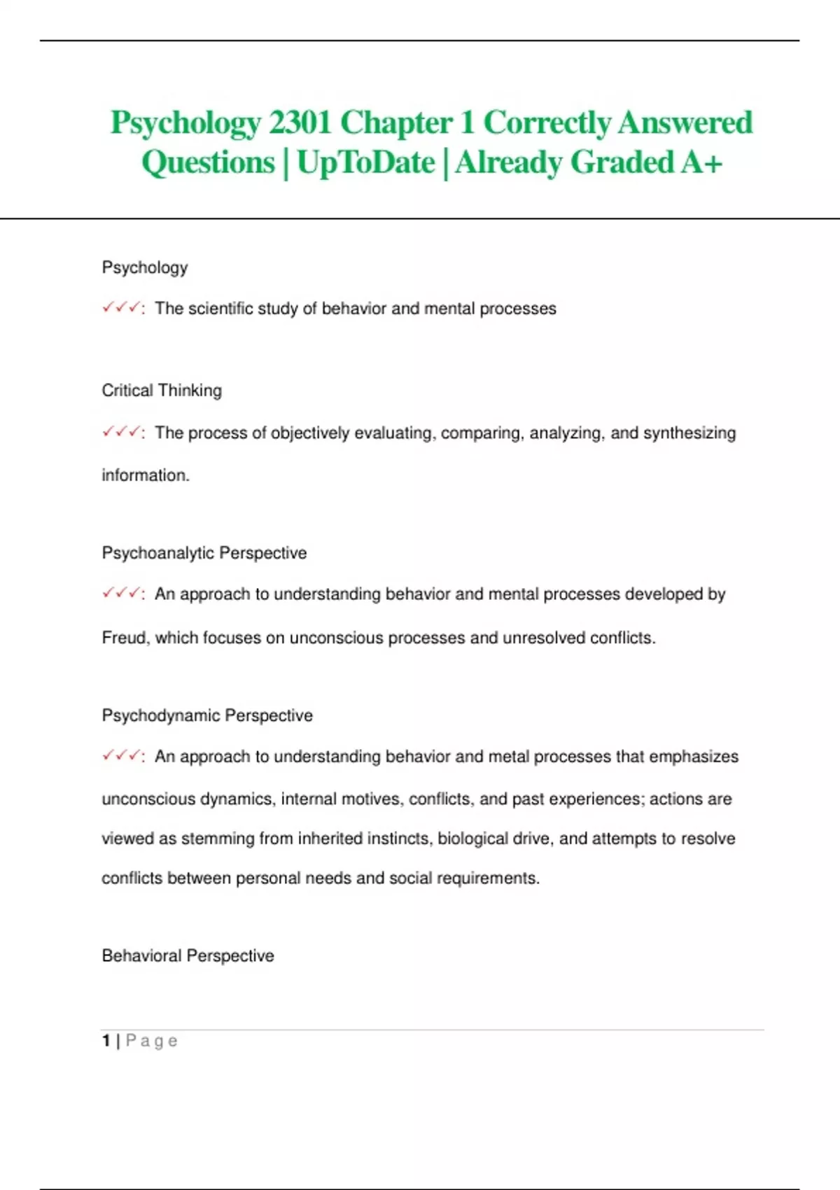 Psychology 2301 Chapter 1 Correctly Answered Questions| UpToDate | Already Graded A+