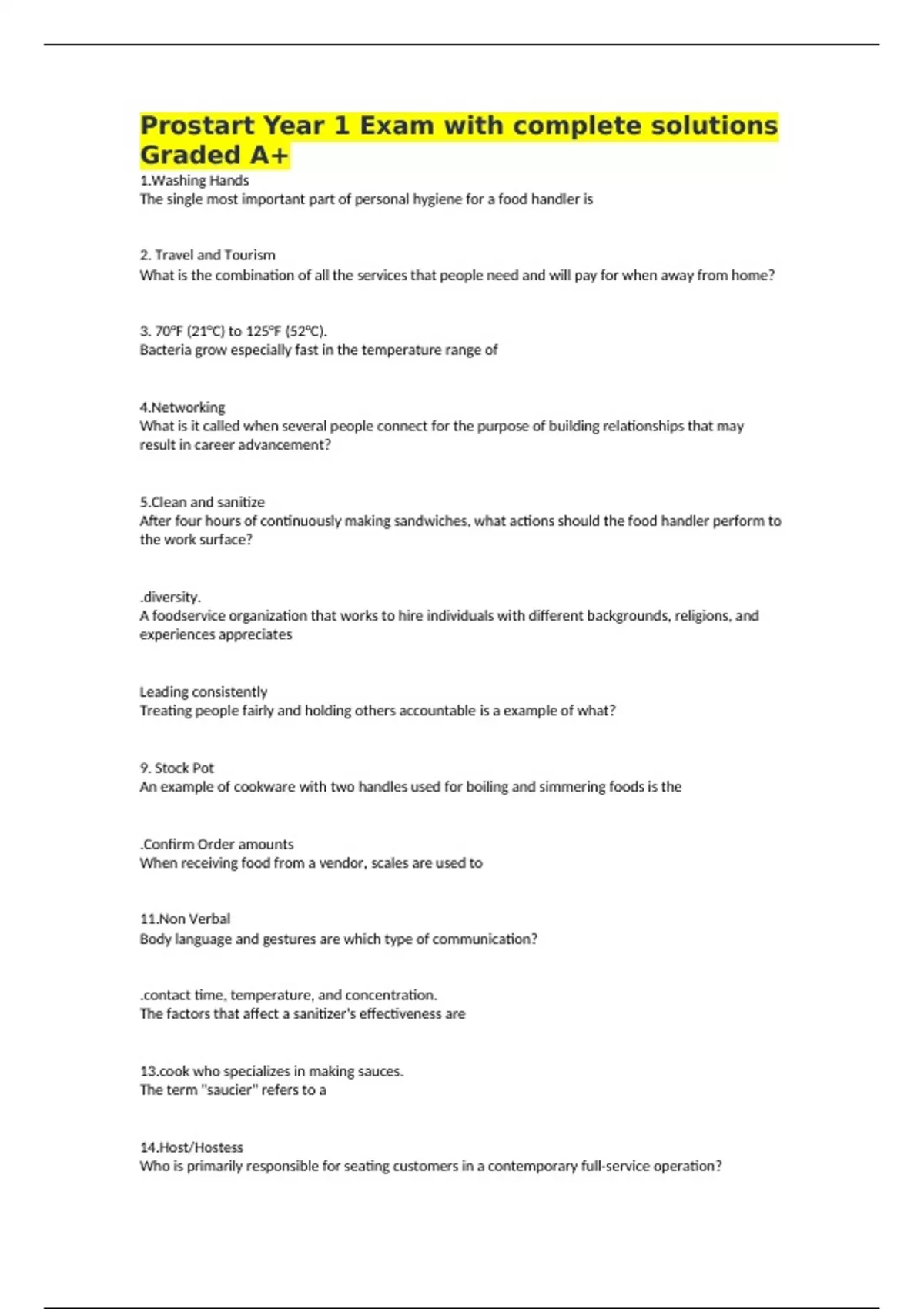 Prostart Year 1 Exam with complete solutions Graded A+ 1.Washing Hands The single most important part of personal hygiene for a food handler is 2. Travel and Tourism What is the combination of all the services that people need and will pay for when away from home? 3. 70°F (21°C) to 125°F (52°C). Bacteria grow especially fast in the temperature range of 4.Networking What is it called when several people connect for the purpose of building relationships that may result in career advancement? 5.Clean and sanitize After four hours of continuously making sandwiches, what actions should the food handler perform to the work surface? .diversity. A foodservice organization that works to hire individuals with different backgrounds, religions, and experiences appreciates Leading consistently Treating people fairly and holding others accountable is a example of what? 9. Stock Pot An example of cookware with two handles used for boiling and simmering foods is the .Confirm Order amounts When receiving food from a vendor, scales are used to 11.Non Verbal Body language and gestures are which type of communication? .contact time, temperature, and concentration. The factors that affect a sanitizer's effectiveness are who specializes in making sauces. The term "saucier" refers to a 14.Host/Hostess Who is primarily responsible for seating customers in a contemporary full-service operation? 15.Hotel In which type of pan should scrambled eggs for a breakfast buffet be placed? .Cake Which type of flour has a low gluten content? 17.(Desired yield / Original Yield) X each ingredient What is the formula for increasing or decreasing a recipe yield? Marketing costs decrease How does good customer service benefit the operation? 19.There is no external heat source Why doesn't the use of microwave ovens for cooking typically allow for browning? Rondelle Which one of the following is a classical knife cut? 21.Contract feeding and self- operators How is foodservice typically handled within the noncommercial segment? .Nodding Which is a respectful way for a listener to agree with a speaker's point? recovery time Which of the following is the PRIMARY consideration when deep- frying multiple large batches of frozen food? Porfolio Which job search tool is a collection of samples that highlight interests, talents, contributions, and studies? empathy 26.Their immune systems have not yet fully developed. Why are preschool-aged children at a higher risk for foodborne illnesses? Mise en place The term used in the restaurant and foodservice industry to "put in place" is called Measurable When referring to "SMART" goals, what does the M stand for? 29.Salad prepping In a typical kitchen, the garde- manger station includes which responsibility? 30. Sliced Tomatoes Which item is most likely to become unsafe when time and temperature are abused? nicating frequently and clearly. An example of personal responsibility in an operation would be 32. Clearing Plate Which task should a server perform from the guest's right side? 33. Pastry The kitchen station that is responsible for decorative sugar is called the 34.Exclude the food handler from the operation If a food handler has diarrhea or has been vomiting, which action must the manager take? ct deliveries. Receiving tables are typically used to tampering. An external safety threat to an operation are persons who engage in aying courtesy, respect, and friendliness. A good first impression can be made by 38.Braising vegetables Which cooking task is best performed in a rondeau? 39.Quick service Which type of restaurant requires a guest to pay before eating? the headwaiter / the maître d' The staff member who is responsible for service throughout the dining room is the garnish Which part of a salad enhances its appearance and complements its overall taste? 42.Spreading pathogens from one surface or food to another What is cross-contamination? Give reason for message