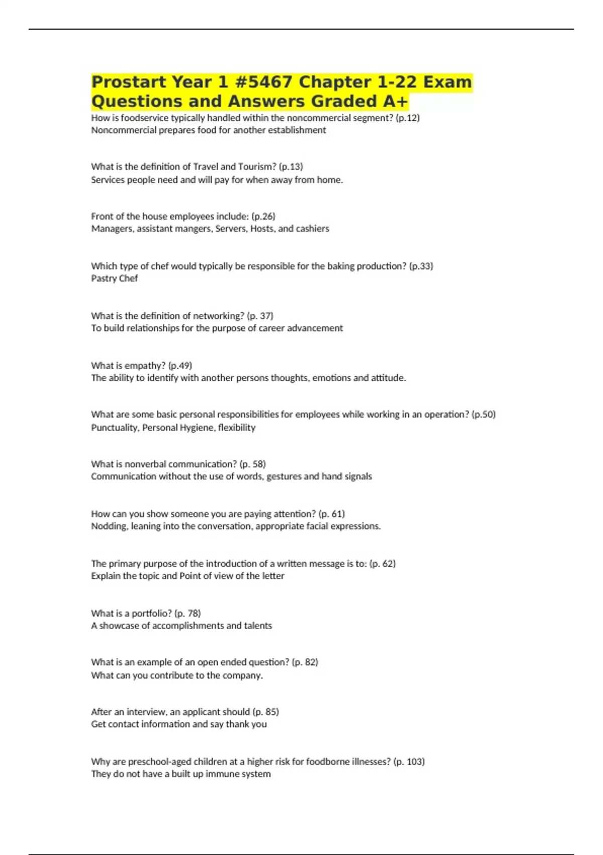 Prostart Year 1 #5467 Chapter 1-22 Exam Questions and Answers Graded A+ How is foodservice typically handled within the noncommercial segment? (p.12) Noncommercial prepares food for another establishment What is the definition of Travel and Tourism? (p.13) Services people need and will pay for when away from home. Front of the house employees include: (p.26) Managers, assistant mangers, Servers, Hosts, and cashiers Which type of chef would typically be responsible for the baking production? (p.33) Pastry Chef What is the definition of networking? (p. 37) To build relationships for the purpose of career advancement What is empathy? (p.49) The ability to identify with another persons thoughts, emotions and attitude. What are some basic personal responsibilities for employees while working in an operation? (p.50) Punctuality, Personal Hygiene, flexibility What is nonverbal communication? (p. 58) Communication without the use of words, gestures and hand signals How can you show someone you are paying attention? (p. 61) Nodding, leaning into the conversation, appropriate facial expressions. The primary purpose of the introduction of a written message is to: (p. 62) Explain the topic and Point of view of the letter What is a portfolio? (p. 78) A showcase of accomplishments and talents What is an example of an open ended question? (p. 82) What can you contribute to the company. After an interview, an applicant should (p. 85) Get contact information and say thank you Why are preschool-aged children at a higher risk for foodborne illnesses? (p. 103) They do not have a built up immune system What is cross-contamination? (p. 104) Transferring pathogens from one food or place to another. What are three forms of food contamination? (p. 104) Physical, chemical, biological What are the six conditions that pathogens need to grow? (p. 105) Food, Acidity, Temperature, Time, Oxygen (FATTOM) What are some foods that are likely to become unsafe if time temperature abused? (p. 107) Fish, Poultry, Shellfish, Dairy Which agency is responsible for the enforcement of food safety regulations? (p. 114) The FDA The single most important part of personal hygiene for a food handler is (p. 123) Washing your hands When must food contact surfaced need to be cleaned and sanitized? (p. 127) After use and before a new type of food, after 4 hours If a food handler has diarrhea or has been vomiting, which action must the manager take? (p. 127) Send them home When using heat as an effective sanitizing method, how many seconds should an item remain in contact with water at 171°F (77°C)? 30 seconds What are the factors that affect a sanitizer's effectiveness? (p. 130) The concentration What are effective methods of denying pests access to an operation? (p. 134) Check deliveries, screen windows, cover drains. Bacteria grow especially fast in the temperature range of (p. 143) 31-135 degrees F How many hours will it take a pathogen in the temperature danger zone to grow to levels high enough to make someone sick? (p. 143) 4 hours TCS food must be thrown out after spending a maximum of how many hours in the temperature danger zone? (p. 143) 4 hours Which product type must meet Grade A standards to be acceptable for receiving? (p. 147) Eggs What is a food safety management system typically designed to prevent? (p. 154) Foodborne Illness What is the primary function of OSHA? (p. 162) To enforce and regulate safety standards What three actions should be performed during an investigation when an on the job accident occurs? (p. 162) Record information, include a description, collect evidence What must employers do to meet the Hazard Communication Standard (HAZCOM)? (p. 165) Report chemical hazards in a job site What are some personal protective equipment worn in an operation? (p. 176) Dry mitts, goggles, Non slip shoes Which class of fire extinguisher should be used to extinguish a deep-fryer fire after the power has been turned off? (p. 179) Class K What should an employee immediately do if a fire occurs? (p. 182) Check if anyone is in danger What are some external safety threats that can happen in an operation? (p. 192) Arson, Theft When receiving food from a vendor, scales are used to (p. 202) To check if what was ordered was delivered What are receiving tables typically used for? (p. 202) To check received items Deck, rotary, and convection are all examples of which type of equipment? (p. 210) Ovens When preparing a recipe designed for a conventional oven in a convection oven, the temperature should be (p. 210)