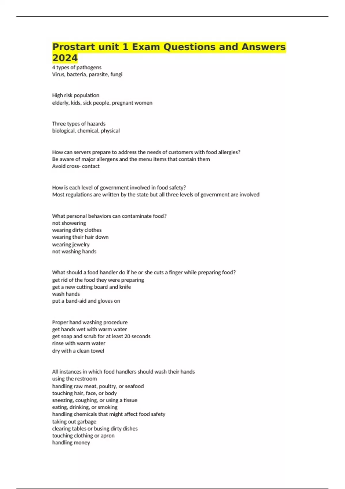 Prostart unit 1 Exam Questions and Answers 2024 4 types of pathogens Virus, bacteria, parasite, fungi High risk population elderly, kids, sick people, pregnant women Three types of hazards biological, chemical, physical How can servers prepare to address the needs of customers with food allergies? Be aware of major allergens and the menu items that contain them Avoid cross- contact How is each level of government involved in food safety? Most regulations are written by the state but all three levels of government are involved What personal behaviors can contaminate food? not showering wearing dirty clothes wearing their hair down wearing jewelry not washing hands What should a food handler do if he or she cuts a finger while preparing food? get rid of the food they were preparing get a new cutting board and knife wash hands put a band-aid and gloves on Proper hand washing procedure get hands wet with warm water get soap and scrub for at least 20 seconds rinse with warm water dry with a clean towel All instances in which food handlers should wash their hands using the restroom handling raw meat, poultry, or seafood touching hair, face, or body sneezing, coughing, or using a tissue eating, drinking, or smoking handling chemicals that might affect food safety taking out garbage clearing tables or busing dirty dishes touching clothing or apron handling money FIFO first-in first-out use older food first Minimum internal temp for Veal 145 degrees for 4 minutes Minimum internal temp for rice that will be hot-held for service 135 degrees Minimum internal temp for seafood 145 degrees for 15 seconds Minimum internal temp for ground meat 155 degrees for 15 seconds Minimum internal temp for poultry 165 degrees for 15 seconds Process for cooling food quickly and safely. Identify ways to help food cool more quickly 135 to 41 in 6 hours 135-70 within 2 hours 70-41 within 4 hours ice bath Three different types of thermometers bimetallic stemmed- check temps from 0-220, useful for hot and cold foods Thermocouples or thermistors - measure temp through metal probe and display them digitally Infrared- measure temp of food and equipment surfaces, doesn't need to touch to check temp Where in the flow of food is cross-contamination most likely to occur? Why? serving because they are handling ready to eat food What is a critical control point (CCP)? points in the process where identified hazards can be prevented What is the purpose of a food safety management system? to prevent food-borne illness What is a critical limit? a requirement that must be met to prevent a hazard Difference between cleaning and sanitizing. cleaning removes food and other dirt from the surface sanitizing reduces pathogens on a surface to safe levels How can you prevent pests from entering an operation? deny pests access to the operation deny pest food, water, and a hiding place check all deliveries screen all windows and vents keep all exterior opening closed tightly cover floor drains seal all cracks in floors and walls cover openings around pipes What is a master cleaning schedule and why is it important in an operation? a schedule for cleaning everything because then you know everything that needs to be cleaned, who should clean it, when it should be cleaned, and how it should be cleaned What is the importance of contact time when sanitizing kitchen equipment? objects must be sanitized for the proper amount of time too long can damage the surface not long enough and it won't be sanitized What is a liability? being legally responsible What is the purpose of a MSDS? Material safety data sheet explains everything you need to know about a chemical that is being used in the kitchen What is the best way for managers to get employees to comply with safety standards? inform them of all safety precautions that need to be taken have consequences for not complying What is a general safety audit and why is it so important? judges the level of safety in the operation 3 classes of fire and the type of fire extinguisher that should be used for each Class A- wood, paper, cloth, or cardboard Class B- flammable liquids and grease Class C- live electrical equipment