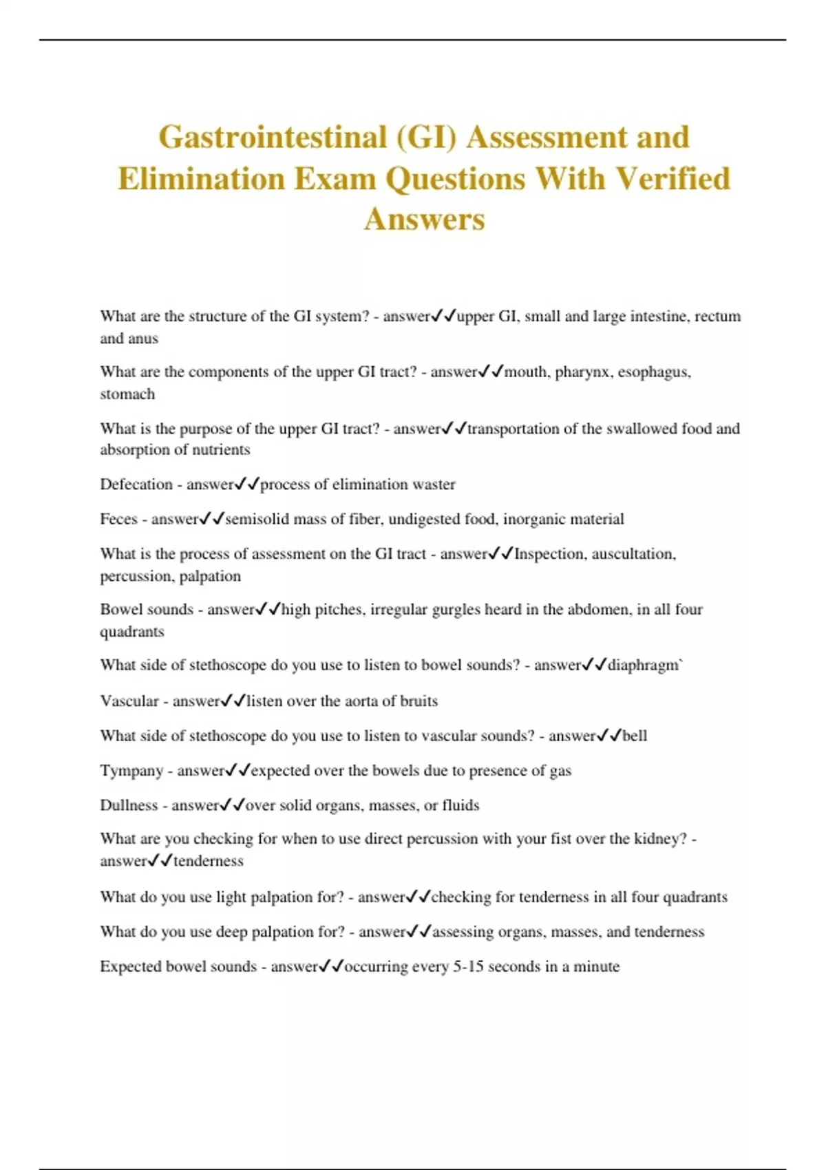 Gastrointestinal (GI) Assessment and Elimination Exam Questions With Verified Answers What are the structure of the GI system? - answerupper GI, small and large intestine, rectum and anus What are the components of the upper GI tract? - answermouth, pharynx, esophagus, stomach What is the purpose of the upper GI tract? - answertransportation of the swallowed food and absorption of nutrients Defecation - answerprocess of elimination waster Feces - answersemisolid mass of fiber, undigested food, inorganic material What is the process of assessment on the GI tract - answerInspection, auscultation, percussion, palpation Bowel sounds - answerhigh pitches, irregular gurgles heard in the abdomen, in all four quadrants What side of stethoscope do you use to listen to bowel sounds? - answerdiaphragm` Vascular - answerlisten over the aorta of bruits What side of stethoscope do you use to listen to vascular sounds? - answerbell Tympany - answerexpected over the bowels due to presence of gas Dullness - answerover solid organs, masses, or fluids What are you checking for when to use direct percussion with your fist over the kidney? - answertenderness What do you use light palpation for?