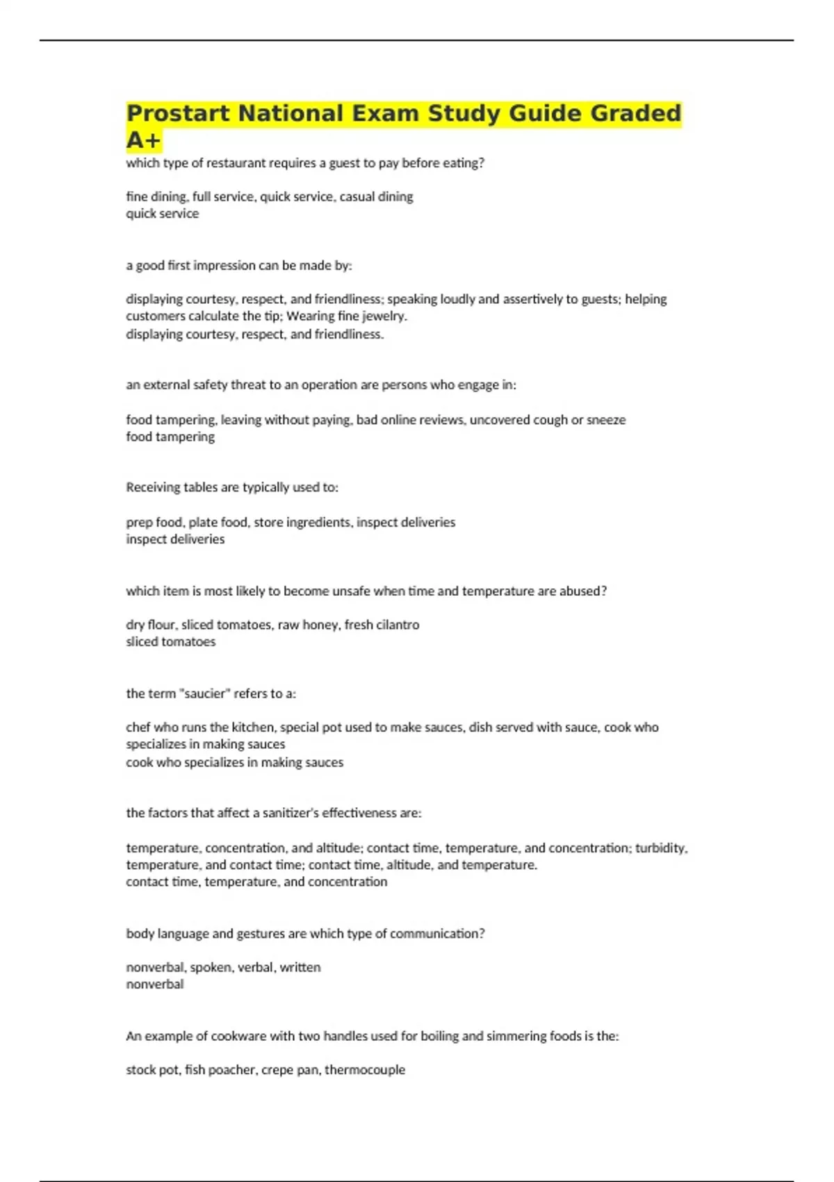 Prostart National Exam Study Guide Graded A+ which type of restaurant requires a guest to pay before eating? fine dining, full service, quick service, casual dining quick service a good first impression can be made by: displaying courtesy, respect, and friendliness; speaking loudly and assertively to guests; helping customers calculate the tip; Wearing fine jewelry. displaying courtesy, respect, and friendliness. an external safety threat to an operation are persons who engage in: food tampering, leaving without paying, bad online reviews, uncovered cough or sneeze food tampering Receiving tables are typically used to: prep food, plate food, store ingredients, inspect deliveries inspect deliveries which item is most likely to become unsafe when time and temperature are abused? dry flour, sliced tomatoes, raw honey, fresh cilantro sliced tomatoes the term "saucier" refers to a: chef who runs the kitchen, special pot used to make sauces, dish served with sauce, cook who specializes in making sauces cook who specializes in making sauces the factors that affect a sanitizer's effectiveness are: temperature, concentration, and altitude; contact time, temperature, and concentration; turbidity, temperature, and contact time; contact time, altitude, and temperature. contact time, temperature, and concentration body language and gestures are which type of communication? nonverbal, spoken, verbal, written nonverbal An example of cookware with two handles used for boiling and simmering foods is the: stock pot, fish poacher, crepe pan, thermocouple stock pot