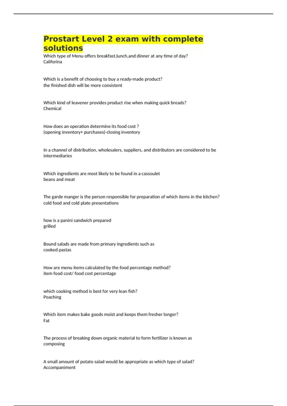 Prostart Level 2 exam with complete solutions Which type of Menu offers breakfast,lunch,and dinner at any time of day? Califorina Which is a benefit of choosing to buy a ready-made product? the finished dish will be more consistent Which kind of leavener provides product rise when making quick breads? Chemical How does an operation determine its food cost ? (opening inventory+ purchases)-closing inventory In a channel of distribution, wholesalers, suppliers, and distributors are considered to be intermediaries Which ingredients are most likely to be found in a cassoulet beans and meat The garde manger is the person responsible for preparation of which items in the kitchen? cold food and cold plate presentations how is a panini sandwich prepared grilled Bound salads are made from primary ingredients such as cooked pastas How are menu items calculated by the food percentage method? item food cost/ food cost percentage which cooking method is best for very lean fish? Poaching Which item makes bake goods moist and keeps them fresher longer? Fat The process of breaking down organic material to form fertilizer is known as composing A small amount of potato salad would be appropriate as which type of salad? Accompaniment What is the formula for increasing or decreasing a recipe yield? (Desired yield / original yield) x Each ingredient amount What traditional form of breakfast potatoes are shredded or chopped raw before being cooked? Hashed brown Why does the cost of food sold NOT equal the cost of actual sold food? Allowances need to be made for waste, employee meals, and promotions The four basic parts of a salad are base, body, garnish, and dressing A profit and loss report is a compilation of which two items? Sales and costs Which option shows the correct progression of milk fat content from lowest to highest? Skim, whole, condensed, half and half, heavy cream An operation that wants to buy food produced by local sources should.....? Start small and look for logical opportunities Which distribution channel does a farmer represent? Primary Materials that are desirable foe composting include Coffee grounds and paper napkins Offering 2- for -1 appetizers every Friday between 3-00 p.m. and 5:00 p.m. is considered which type of market communication Sales promotion How is the biscuit method for making quick breads different from other methods? A fat is rubbed or cut into the flour untill he mixture is mealy or bumpy in appearance Which raw, enzyme- containing fruit dissolves gelatin? pineapple Chapati, naan, and paratha are names for which items used in a cuisine from india ? Flatbreads The method of roasting meat on skewers over fire, which is very popular in Brazil, is referred to as , Churrasco Cholesterol can be found in Milk Which food is characteristic of southern cuisine? Jambalaya The goal of target marketing is to Make a focused appeal to a distinct group of customers If projected monthly food cost are 15,000 and food sales are 45,000 the food cost percentage is 33 Which product is legally protected from imitation by the Spanish government Jamon iberico The main purpose of bread in a sandwich is the provide bulk Yeast beds are the most often made using which two primary methods? Straight-dough and sponge What is mole Slow-cooked sauce with complex flavor In Jamaica, meat is seasoned with a spicy dry rub called? Curry powdeer Which document is useful for determining costs that have gotten out of line, judging the operations efficiency, making basic management decisions? Profit -and lose report Iron content increases when cooking meat in an iron pan tomato Which type of forecast uses the number of expecting guests to determine purchasing needs? customer count The primary purpose of SWOT analysis is to..? Understand a business's current state and opportunities The new england boiled dinner includes.....? Corned beef brisket, potatoes, and cabbage