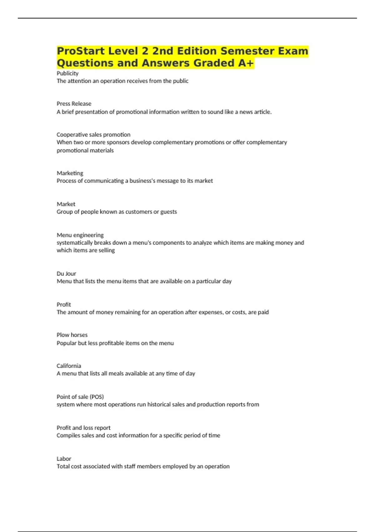 ProStart Level 2 2nd Edition Semester Exam Questions and Answers Graded A+ Publicity The attention an operation receives from the public Press Release A brief presentation of promotional information written to sound like a news article. Cooperative sales promotion When two or more sponsors develop complementary promotions or offer complementary promotional materials Marketing Process of communicating a business's message to its market Market Group of people known as customers or guests Menu engineering systematically breaks down a menu's components to analyze which items are making money and which items are selling Du Jour Menu that lists the menu items that are available on a particular day Profit The amount of money remaining for an operation after expenses, or costs, are paid Plow horses Popular but less profitable items on the menu California A menu that lists all meals available at any time of day Point of sale (POS) system where most operations run historical sales and production reports from Profit and loss report Compiles sales and cost information for a specific period of time Labor Total cost associated with staff members employed by an operation