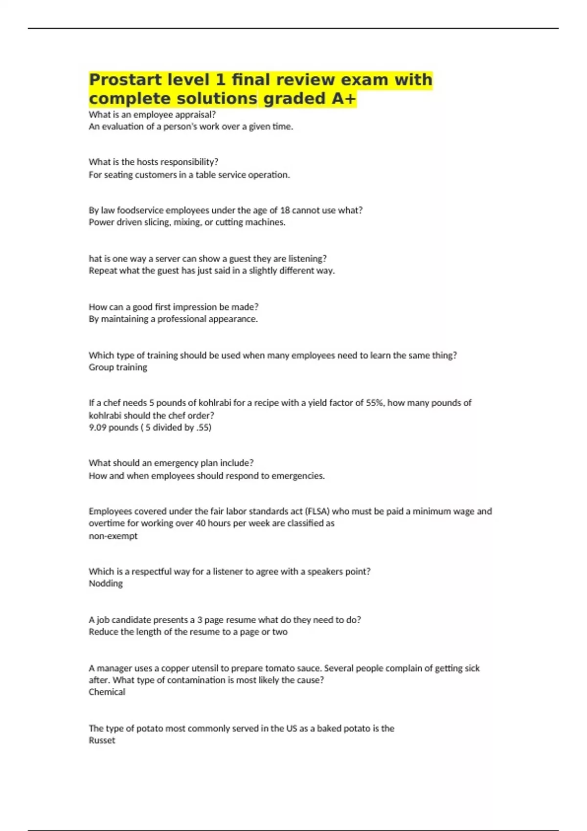 Prostart level 1 final review exam with complete solutions graded A+ What is an employee appraisal? An evaluation of a person's work over a given time. What is the hosts responsibility? For seating customers in a table service operation. By law foodservice employees under the age of 18 cannot use what? Power driven slicing, mixing, or cutting machines. hat is one way a server can show a guest they are listening? Repeat what the guest has just said in a slightly different way. How can a good first impression be made? By maintaining a professional appearance. Which type of training should be used when many employees need to learn the same thing? Group training If a chef needs 5 pounds of kohlrabi for a recipe with a yield factor of 55%, how many pounds of kohlrabi should the chef order? 9.09 pounds ( 5 divided by .55) What should an emergency plan include? How and when employees should respond to emergencies. Employees covered under the fair labor standards act (FLSA) who must be paid a minimum wage and overtime for working over 40 hours per week are classified as non-exempt Which is a respectful way for a listener to agree with a speakers point? Nodding A job candidate presents a 3 page resume what do they need to do? Reduce the length of the resume to a page or two A manager uses a copper utensil to prepare tomato sauce. Several people complain of getting sick after. What type of contamination is most likely the cause? Chemical The type of potato most commonly served in the US as a baked potato is the Russet