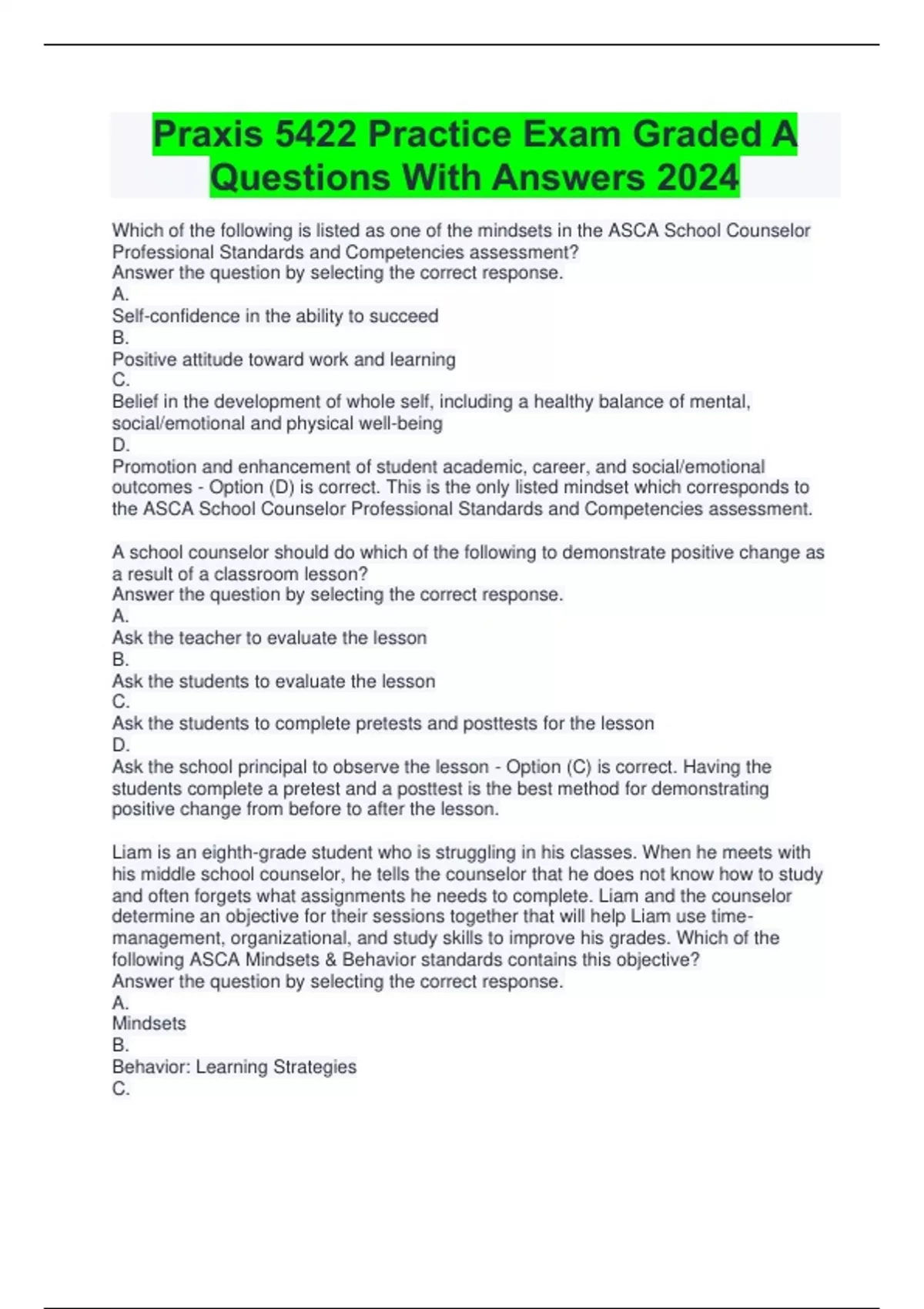 Which of the following is listed as one of the mindsets in the ASCA School Counselor Professional Standards and Competencies assessment? Answer the question by selecting the correct response. A. Self-confidence in the ability to succeed B. Positive attitude toward work and learning C. Belief in the development of whole self, including a healthy balance of mental, social/emotional and physical well-being D. Promotion and enhancement of student academic, career, and social/emotional outcomes - Option (D) is correct. This is the only listed mindset which corresponds to the ASCA School Counselor Professional Standards and Competencies assessment. A school counselor should do which of the following to demonstrate positive change as a result of a classroom lesson? Answer the question by selecting the correct response. A. Ask the teacher to evaluate the lesson B. Ask the students to evaluate the lesson C. Ask the students to complete pretests and posttests for the lesson D. Ask the school principal to observe the lesson - Option (C) is correct. Having the students complete a pretest and a posttest is the best method for demonstrating positive change from before to after the lesson. Liam is an eighth-grade student who is struggling in his classes. When he meets with his middle school counselor, he tells the counselor that he does not know how to study and often forgets what assignments he needs to complete. Liam and the counselor determine an objective for their sessions together that will help Liam use time-management, organizational, and study skills to improve his grades. Which of the following ASCA Mindsets & Behavior standards contains this objective? Answer the question by selecting the correct response. A. Mindsets B. Behavior: Learning Strategies C. Behavior: Self-Management Skills D. Behavior: Social Skills - Option (B) is correct. The objective is directly written from the Behavior Standard, Learning Strategies B-LS 3. Use time management, organizational, and study skills. A frequently applied career theory used with students explores students' knowledge of the self and the world of work by reflecting on their interests, abilities, and values. The theory classifies students according to six personality types: realistic, investigative, artistic, social, enterprising, and conventional. Which of the following is the name of this classification system? Answer the question by selecting the correct response. A. Holland codes B. Life-span, life-space approach C. Circumscription and compromise theory D. Happenstance learning theory - Option (A) is correct. The Holland codes are part of John Holland's Theory of Vocational Choice (1973), which is one of the most well-known theories in career-based school counseling. The idea of career-based personality types is built into assessments. Which of the following best describes consultation services? Answer the question by selecting the correct response. A. School counselors make recommendations based on appraisal of tests, inventories, and other data to help students make decisions for their future. B. School counselors work with students to analyze and assess their abilities, interests, skills, and achievements. C. Multiple individuals work toward a common goal and share responsibility for the associated tasks. D. Information is gathered from experts about student needs, and information, opinions, and recommendations are provided to individuals who can support those needs. - Option (D) is correct. Gathering information from experts about student needs and providing information, opinions, and recommendations to individuals who can support those needs is the definition of consultation, according to the ASCA National Model. Which of the following approaches should a school counselor take when making an outside referral for a student to receive long-term intensive services? Answer the question by selecting the correct response. A. Agreeing to meet with the student outside of the school day to continue offering support if the school counselor has appropriate state licensing B. Recommending specific trusted agencies within the community to the student for additional support C. Providing multiple referrals from the district's vetted list, being careful not to endorse or show a preference for a particular counselor or practice D. Consulting with the student's parents and agreeing to provide intensive services during the school day to make it convenient for the family - Option (C) is correct. According to the ASCA Ethical Standards, school counselors should always provide a list of referral options with multiple therapeutic counselors and agencies. The school counselors can work with the parents so that they are knowledgeable of what to ask for, but it is ultimately up to the parents to make the phone calls, conduct the interviews, and select the outside counselor or agency that they feel will best provide intensive services for their child. Which of the following impacts does technology have on a school counselor when used with intentionality and purpose in serving all students? Answer the question by selecting the correct response. A. It expands the school counselor's reach and efficiency. B. It places a school counselor in a potential legal and ethical dilemma. C. It causes dual relationships and should be avoided. D. It causes a school counselor's role to become irrelevant. - Option (A) is correct. By using technology appropriately, a school counselor can reach and impact a greater number of students through the school counseling program and also meet the challenges of managing large caseloads. A school counseling team wants to increase the number of students in the sixth grade that are meeting or exceeding standards according to the state math achievement tests. The school counseling team has determined that many parents do not have a strong understanding of the math curriculum and are not able to adequately assist their children with homework. Addition