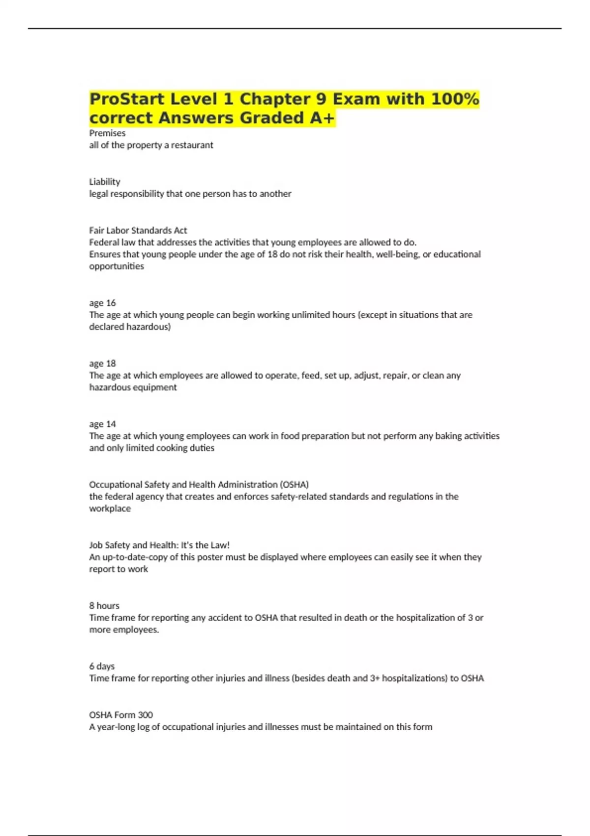 ProStart Level 1 Chapter 9 Exam with 100% correct Answers Graded A+ Premises all of the property a restaurant Liability legal responsibility that one person has to another Fair Labor Standards Act Federal law that addresses the activities that young employees are allowed to do. Ensures that young people under the age of 18 do not risk their health, well-being, or educational opportunities age 16 The age at which young people can begin working unlimited hours (except in situations that are declared hazardous) age 18 The age at which employees are allowed to operate, feed, set up, adjust, repair, or clean any hazardous equipment age 14 The age at which young employees can work in food preparation but not perform any baking activities and only limited cooking duties Occupational Safety and Health Administration (OSHA) the federal agency that creates and enforces safety-related standards and regulations in the workplace Job Safety and Health: It's the Law! An up-to-date-copy of this poster must be displayed where employees can easily see it when they report to work 8 hours Time frame for reporting any accident to OSHA that resulted in death or the hospitalization of 3 or more employees. 6 days Time frame for reporting other injuries and illness (besides death and 3+ hospitalizations) to OSHA OSHA Form 300 A year-long log of occupational injuries and illnesses must be maintained on this form OSHA Form 300A