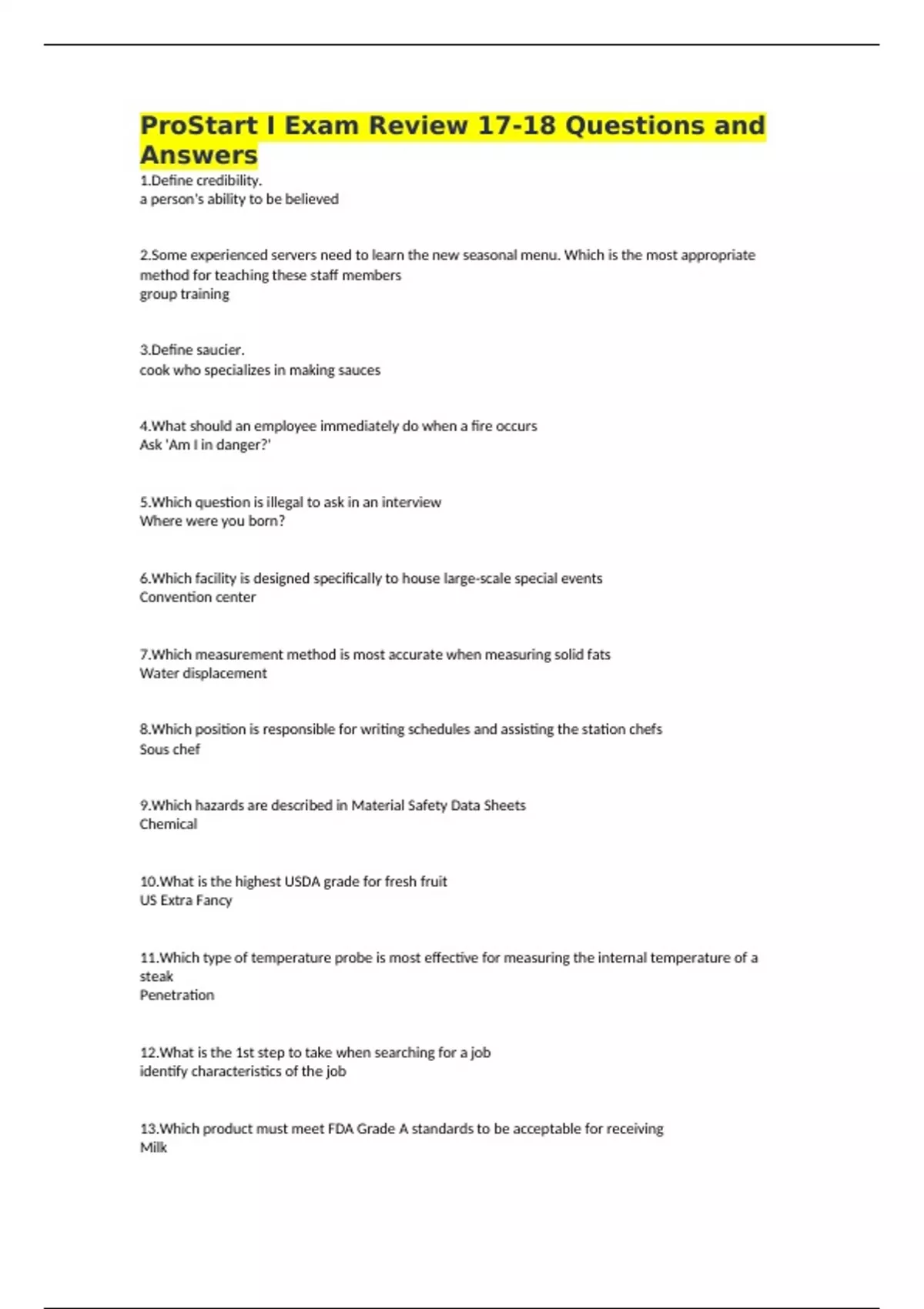 ProStart I Exam Review 17-18 Questions and Answers 1.Define credibility. a person's ability to be believed 2.Some experienced servers need to learn the new seasonal menu. Which is the most appropriate method for teaching these staff members group training 3.Define saucier. cook who specializes in making sauces 4.What should an employee immediately do when a fire occurs Ask 'Am I in danger?' 5.Which question is illegal to ask in an interview Where were you born? 6.Which facility is designed specifically to house large-scale special events Convention center 7.Which measurement method is most accurate when measuring solid fats Water displacement 8.Which position is responsible for writing schedules and assisting the station chefs Sous chef 9.Which hazards are described in Material Safety Data Sheets Chemical 10.What is the highest USDA grade for fresh fruit US Extra Fancy 11.Which type of temperature probe is most effective for measuring the internal temperature of a steak Penetration 12.What is the 1st step to take when searching for a job identify characteristics of the job 13.Which product must meet FDA Grade A standards to be acceptable for receiving Milk 14.Define roux.