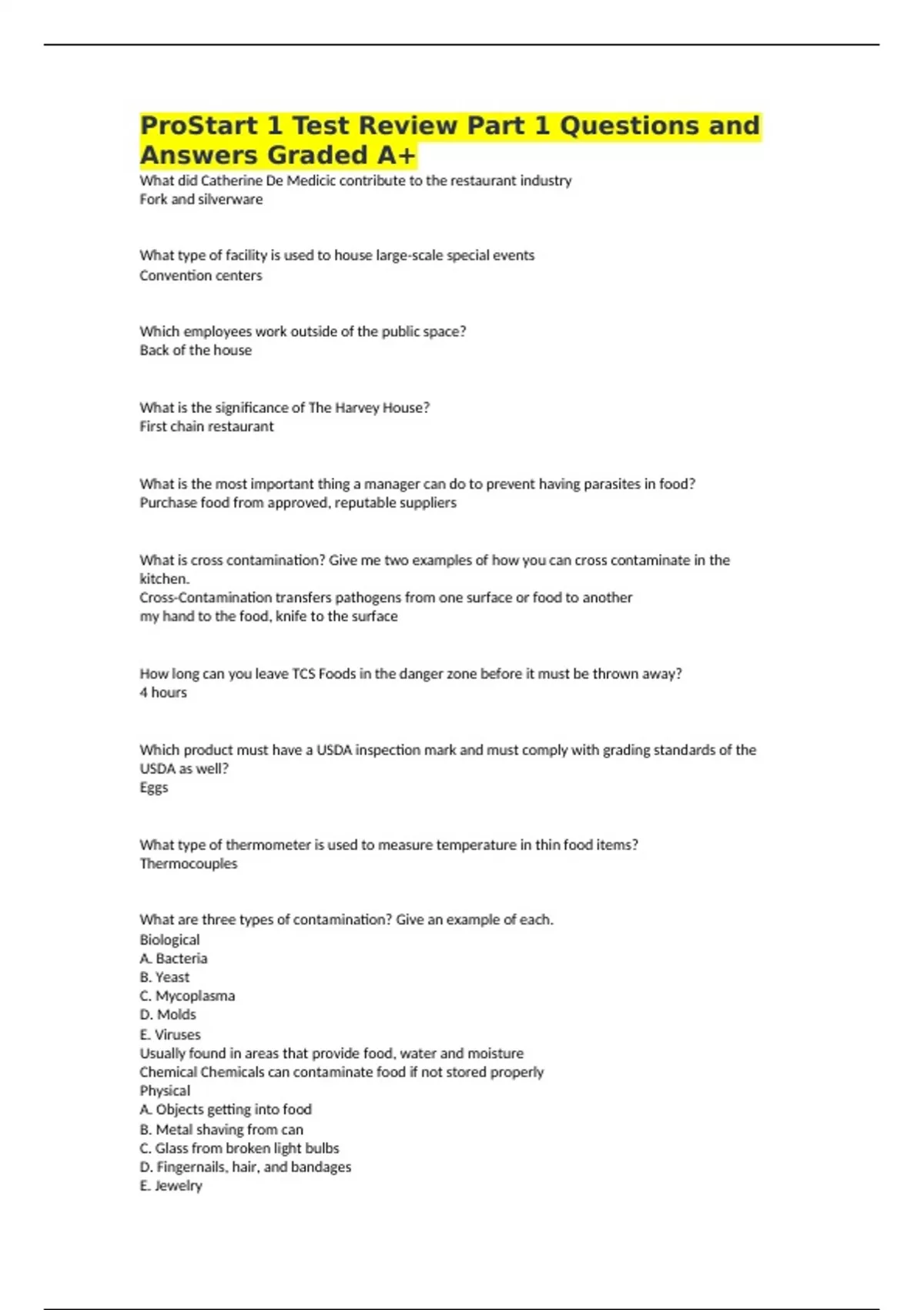 ProStart 1 Test Review Part 1 Questions and Answers Graded A+ What did Catherine De Medicic contribute to the restaurant industry Fork and silverware What type of facility is used to house large-scale special events Convention centers Which employees work outside of the public space? Back of the house What is the significance of The Harvey House? First chain restaurant What is the most important thing a manager can do to prevent having parasites in food? Purchase food from approved, reputable suppliers What is cross contamination? Give me two examples of how you can cross contaminate in the kitchen. Cross-Contamination transfers pathogens from one surface or food to another my hand to the food, knife to the surface How long can you leave TCS Foods in the danger zone before it must be thrown away? 4 hours Which product must have a USDA inspection mark and must comply with grading standards of the USDA as well? Eggs What type of thermometer is used to measure temperature in thin food items? Thermocouples What are three types of contamination? Give an example of each. Biological A. Bacteria B. Yeast C. Mycoplasma D. Molds E. Viruses Usually found in areas that provide food, water and moisture Chemical Chemicals can contaminate food if not stored properly Physical A. Objects getting into food B. Metal shaving from can C. Glass from broken light bulbs D. Fingernails, hair, and bandages E. Jewelry F. Fruit pit Chapter 3 ... What are the consequences of a food borne illness outbreak? Loss of customer sales Negative media exposer Lawsuits and legal fees Increased insurance premiums Loss of reputation Lowered employee morale Employee absenteeism Staff retaining What types of food are commonly associated with food borne illness outbreaks? ready to eat foods What are common allergens all food employees need to be aware of? A. Milk and dairy products B. Eggs and egg products C. Fish D. Shellfish (crab, shrimp, lobster) E. Soy and soy products F. Peanuts G. Tree nuts, such as pecans and walnuts What is HACCP? What are the steps to a HACCP plan? Hazard Analysis Critical Control Point A system of an example of a food safety management system 1. Conduct a hazard analysis 2. Determine critical control points (CCPS) 3. Establish critical limits 4. Establish monitoring procedures 5. Identify corrective actions 6. Verify that the system works 7. Establish procedures for record keeping and documentation What is FATTOM? Why is it important? A way to remember the six conditions pathogens need to grow. It tells what the conditions are What is the safest way to thaw food? Thaw food in a cooler What does TCS stand for? Give me an example of two TCS foods Time/Temperature control for safety Milk and dairy products Meat, beef, pork, and lamb What must all employers do to meet the HAZCOM Standard? Requires that all employers notify their employees about chemical hazards present on the job and train employees to use these materials safely What is an emergency plan? What must it consist of? A plan to protect workers, guest, and property in the case of an emergency or disaster, A. Floor plans of the facility, noting first aid stations, alarms, sprinklers, and fire extinguishers B. Evacuation routes C. Emergency telephone numbers for each type of emergency What category of equipment are minors never allowed to use? Power driven equipment that have cutting involved Hazardous Equipment, power-driven meat processing machines, meat slicer, meat saws, patty forming machines, meat grinders, meat choppers, commercial mixers, and power-driven bakery machines. What type of jobs can a 15 year old perform in a restaurant operation according to FLSA? Food prep areas but not cooking or baking Who is responsible for informing all employees of the importance of job safety and health protection in a work place? Employers What does OSHA stand for? What is their main job? Occupational Safety and Health Administration they regulate the federal standards What is personal protective equipment? What does it include? It is protective gear that protects employees from potential hazards on the job. A. gloves B. goggles If a customer slips on ice outside of a restaurant who is responsible for the injury? Why? Restaurant because it was on their property What are the different types of fire extinguishers? What are each used for? Class A- Ordinary Combustible Class B- Flammable Liquids (Grease Fires) Class C- Electrical Equipment What is an MSDS sheet? What hazards are described? Material Safety Data Sheet Hazardous ingredients & identity information & chemicals & how to get rid of it Describe what personal responsibility means in an operation. Give me two examples of how an employee can show personal responsibility. A person is responsible for the choices he or she makes the way they think or feel accepts accountability and is in control What is the formula for finding the conversion factor? If I have a recipe for 75 and I want to make it only for 15 people, what would the conversion factor be? Desired yield divided by original yield .2 What is the importance of using standardized recipes in a restaurant setting? Always to be consistent What typical things are prepared in the garde manger station? cold foods preparation What does mise en place mean? To gather all ingredients to prepare and assemble of ingredients, pans, utensils, and equipment or serving pieces need for a particular dish or service. It's important because you want to be sure you have everything needed to prepare the dish. How do you find the decimal equivalent to a fraction? What would ¾ be as a decimal? 1/6? Divide the top of the faction by the bottom ¾= .75 1/6= . Chapter 5 Chapter 5 How many tablespoons are in a cup? Pint? Quart? Gallon? 1 cup= 16 tablespoons 1 pint= 32 tablespoons 1 quart= 64 tablespoons 1 gallon= 256 tablespoons In the kitchen brigade system what type of food would a poissonier prepare? fish What is the formula for finding % yield in a recipe? If a recipe c