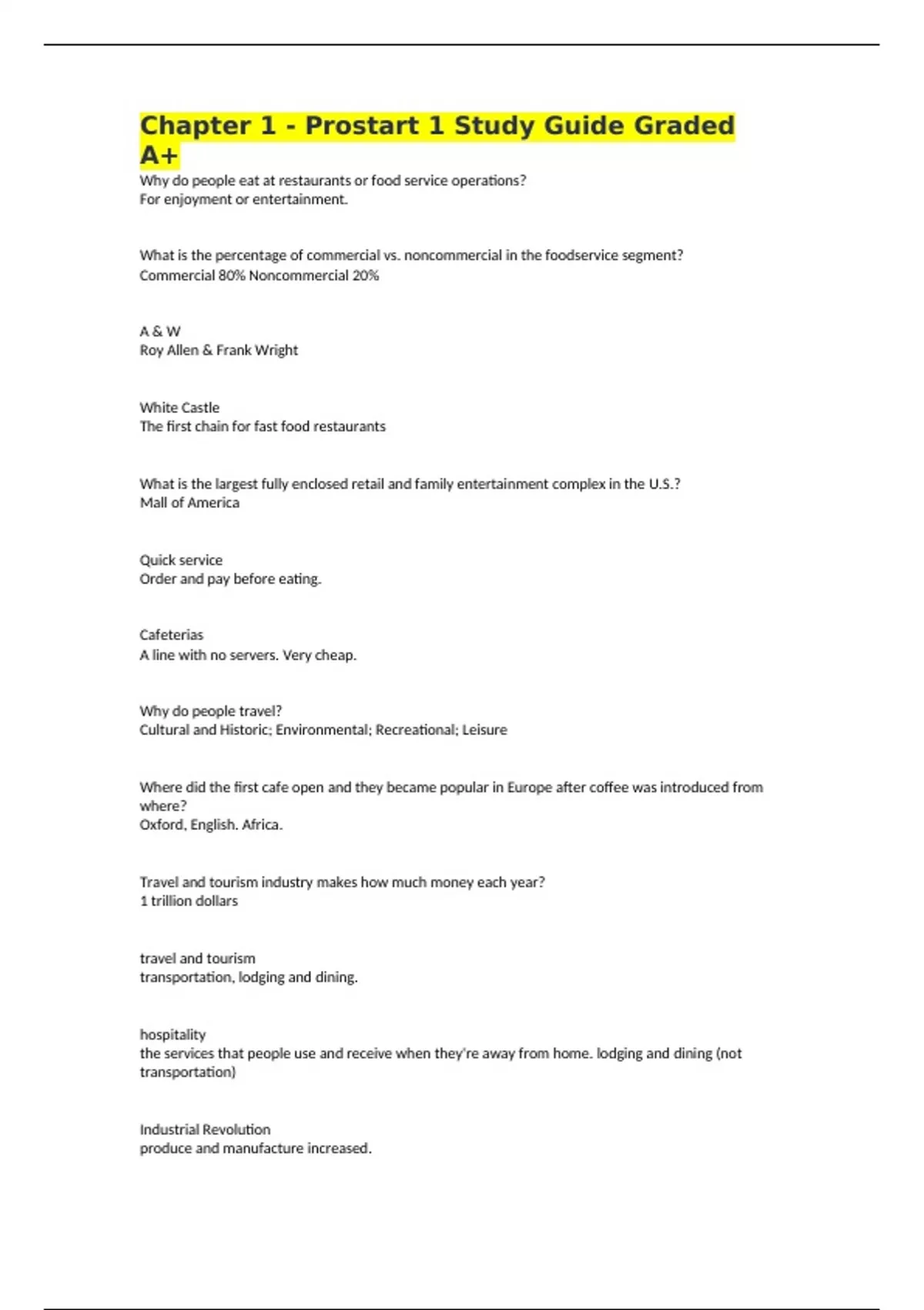 Chapter 1 - Prostart 1 Study Guide Graded A+ Why do people eat at restaurants or food service operations? For enjoyment or entertainment. What is the percentage of commercial vs. noncommercial in the foodservice segment? Commercial 80% Noncommercial 20% A & W Roy Allen & Frank Wright White Castle The first chain for fast food restaurants What is the largest fully enclosed retail and family entertainment complex in the U.S.? Mall of America Quick service Order and pay before eating. Cafeterias A line with no servers. Very cheap. Why do people travel? Cultural and Historic; Environmental; Recreational; Leisure Where did the first cafe open and they became popular in Europe after coffee was introduced from where? Oxford, English. Africa. Travel and tourism industry makes how much money each year? 1 trillion dollars travel and tourism transportation, lodging and dining. hospitality the services that people use and receive when they're away from home. lodging and dining (not transportation) Industrial Revolution produce and manufacture increased. guilds