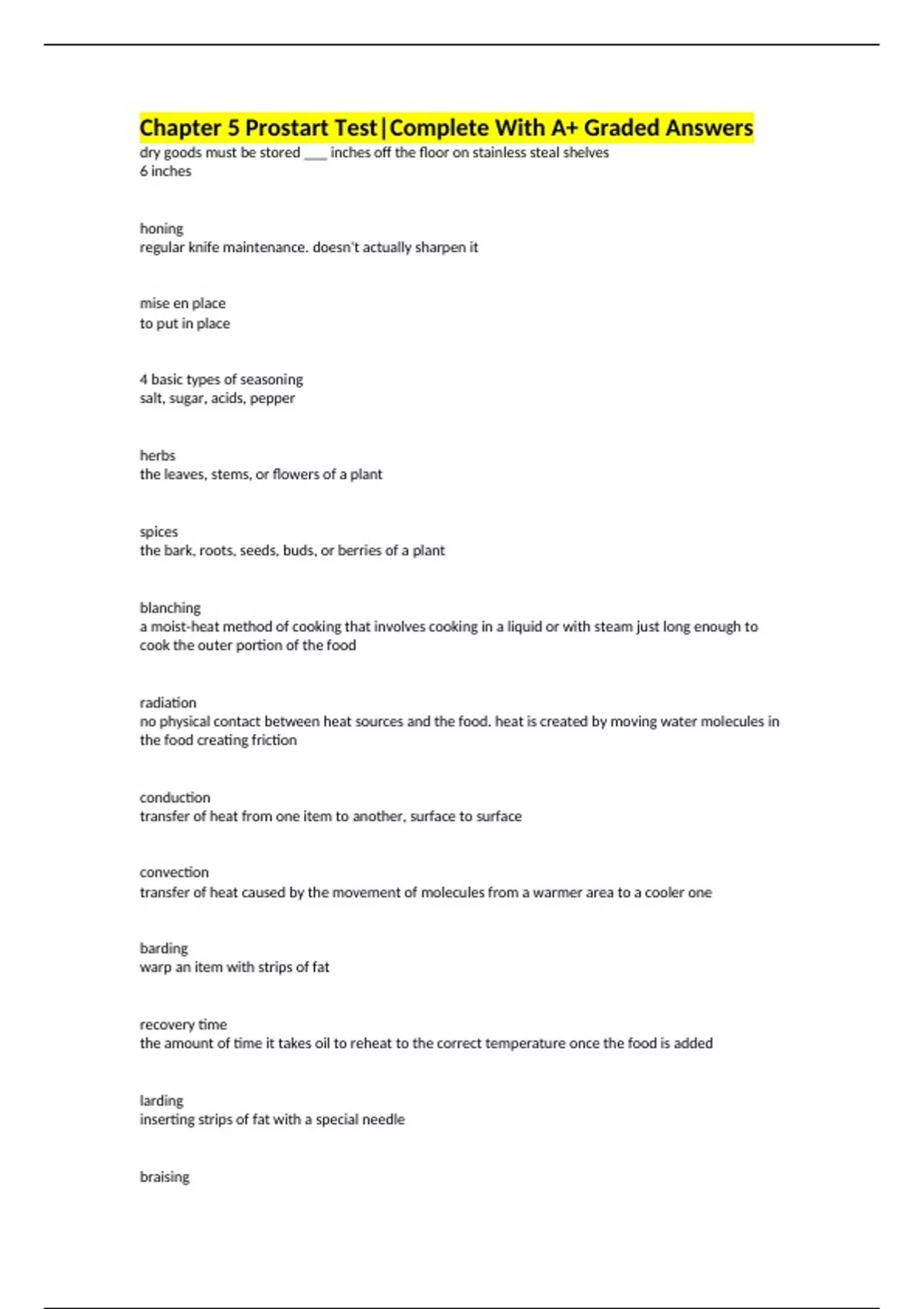 Chapter 5 Prostart Test|Complete With A+ Graded Answers dry goods must be stored ___ inches off the floor on stainless steal shelves 6 inches honing regular knife maintenance. doesn't actually sharpen it mise en place to put in place 4 basic types of seasoning salt, sugar, acids, pepper herbs the leaves, stems, or flowers of a plant spices the bark, roots, seeds, buds, or berries of a plant blanching a moist-heat method of cooking that involves cooking in a liquid or with steam just long enough to cook the outer portion of the food radiation no physical contact between heat sources and the food. heat is created by moving water molecules in the food creating friction conduction transfer of heat from one item to another, surface to surface convection transfer of heat caused by the movement of molecules from a warmer area to a cooler one barding warp an item with strips of fat recovery time the amount of time it takes oil to reheat to the correct temperature once the food is added larding inserting strips of fat with a special needle braising