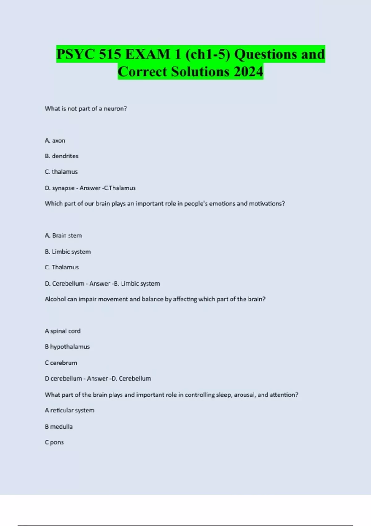 PSYC 515 EXAM 1 (ch1-5) Questions and Correct Solutions 2024 What is not part of a neuron? A. axon B. dendrites C. thalamus D. synapse - Answer -C.Thalamus Which part of our brain plays an important role in people's emotions and motivations? A. Brain stem B. Limbic system C. Thalamus D. Cerebellum - Answer -B. Limbic system Alcohol can impair movement and balance by affecting which part of the brain? A spinal cord B hypothalamus C cerebrum D cerebellum - Answer -D. Cerebellum What part of the brain plays and important role in controlling sleep, arousal, and attention? A reticular system B medulla C ponsD spinal cord - Answer -A. Reticular system The myelin sheath is responsible for______. - Answer -increasing the speed of nerve impulses and preventing them from being interfered with by adjacent nerve impulses What is the correct order in which a message travels through a neuron? A. dendrites > axon> cell body> synaptic knobs B. Synaptic knobs > dendrites > cell body > axon C. Cell body > axon > dendrites > synaptic knobs D. dendrites > cell body > axon > synaptic knobs - Answer -D. dendrites > cell body > axon > synaptic knobs Which brain structure maintains the body's homeostasis and contributes to feelings of hunger or thirst