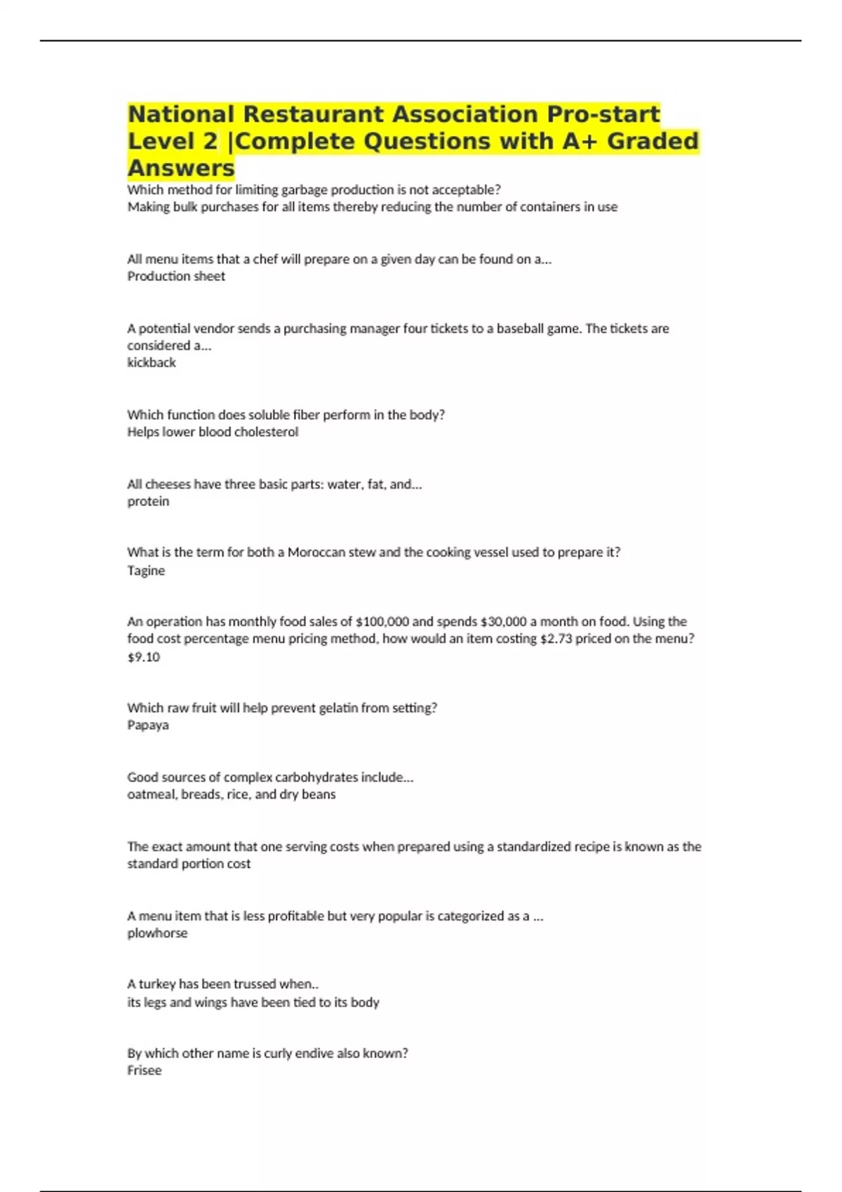 National Restaurant Association Pro-start Level 2 |Complete Questions with A+ Graded Answers Which method for limiting garbage production is not acceptable? Making bulk purchases for all items thereby reducing the number of containers in use All menu items that a chef will prepare on a given day can be found on a... Production sheet A potential vendor sends a purchasing manager four tickets to a baseball game. The tickets are considered a... kickback Which function does soluble fiber perform in the body? Helps lower blood cholesterol All cheeses have three basic parts: water, fat, and... protein What is the term for both a Moroccan stew and the cooking vessel used to prepare it? Tagine An operation has monthly food sales of $100,000 and spends $30,000 a month on food. Using the food cost percentage menu pricing method, how would an item costing $2.73 priced on the menu? $9.10 Which raw fruit will help prevent gelatin from setting? Papaya Good sources of complex carbohydrates include... oatmeal, breads, rice, and dry beans The exact amount that one serving costs when prepared using a standardized recipe is known as the standard portion cost A menu item that is less profitable but very popular is categorized as a ... plowhorse A turkey has been trussed when.. its legs and wings have been tied to its body By which other name is curly endive also known? Frisee
