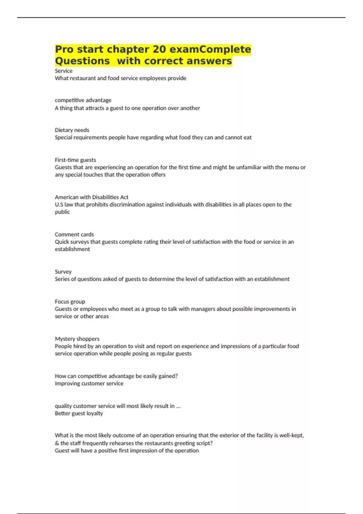 Pro start chapter 20 examComplete Questions with correct answers Service What restaurant and food service employees provide competitive advantage A thing that attracts a guest to one operation over another Dietary needs Special requirements people have regarding what food they can and cannot eat First-time guests Guests that are experiencing an operation for the first time and might be unfamiliar with the menu or any special touches that the operation offers American with Disabilities Act U.S law that prohibits discrimination against individuals with disabilities in all places open to the public Comment cards Quick surveys that guests complete rating their level of satisfaction with the food or service in an establishment Survey Series of questions asked of guests to determine the level of satisfaction with an establishment Focus group Guests or employees who meet as a group to talk with managers about possible improvements in service or other areas Mystery shoppers People hired by an operation to visit and report on experience and impressions of a particular food service operation while people posing as regular guests How can competitive advantage be easily gained? Improving customer service quality customer service will most likely result in ... Better guest loyalty What is the most likely outcome of an operation ensuring that the exterior of the facility is well-kept, & the staff frequently rehearses the restaurants greeting script? Guest will have a positive first impression of the operation