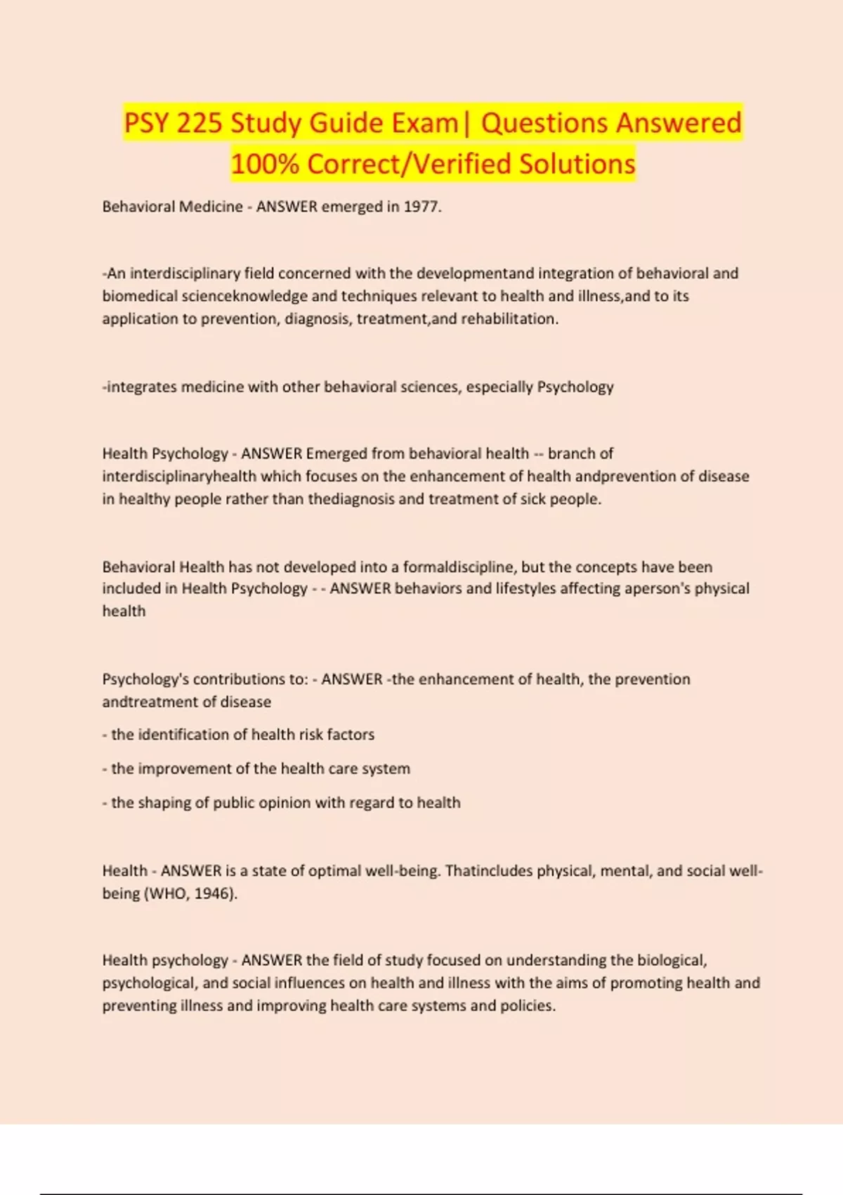 Behavioral Medicine - ANSWER emerged in 1977. -An interdisciplinary field concerned with the developmentand integration of behavioral and biomedical scienceknowledge and techniques relevant to health and illness,and to its application to prevention, diagnosis, treatment,and rehabilitation. -integrates medicine with other behavioral sciences, especially Psychology Health Psychology - ANSWER Emerged from behavioral health -- branch of interdisciplinaryhealth which focuses on the enhancement of health andprevention of disease in healthy people rather than thediagnosis and treatment of sick people.