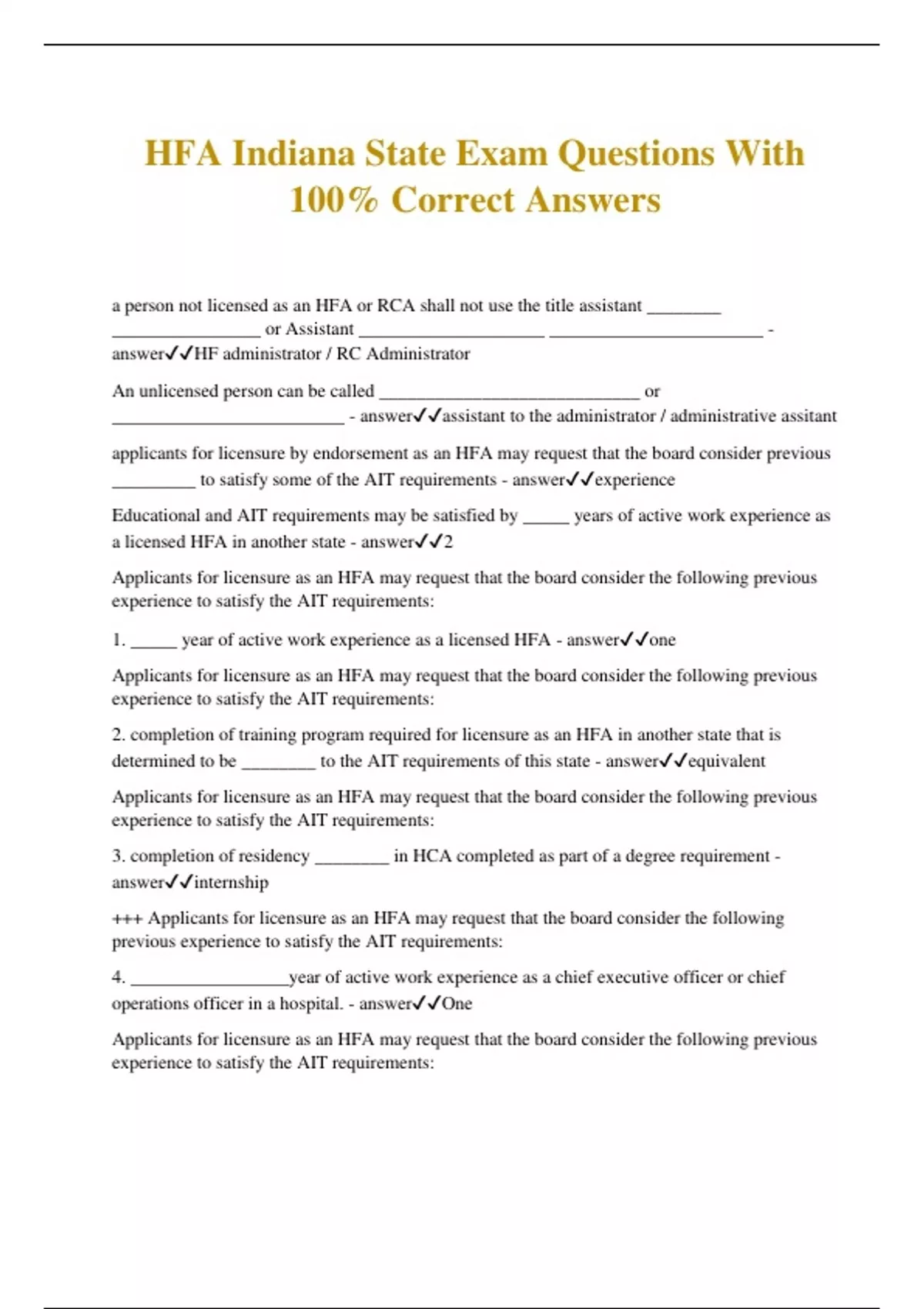 HFA Indiana State Exam Questions With 100% Correct Answers a person not licensed as an HFA or RCA shall not use the title assistant ________ ________________ or Assistant ____________________ _______________________ - answerHF administrator / RC Administrator An unlicensed person can be called ____________________________ or _________________________ - answerassistant to the administrator / administrative assitant applicants for licensure by endorsement as an HFA may request that the board consider previous _________ to satisfy some of the AIT requirements - answerexperience Educational and AIT requirements may be satisfied by _____ years of active work experience as a licensed HFA in another state - answer2 Applicants for licensure as an HFA may request that the board consider the following previous experience to satisfy the AIT requirements: 1. _____ year of active work experience as a licensed HFA - answerone Applicants for licensure as an HFA may request that the board consider the following previous experience to satisfy the AIT requirements: 2. completion of training program required for licensure as an HFA in another state that is determined to be ________ to the AIT requirements of this state - answerequivalent Applicants for licensure as an HFA may request that the board consider the following previous experience to satisfy the AIT requirements: 3. completion of residency ________ in HCA completed as part of a degree requirement - answerinternship +++ Applicants for licensure as an HFA may request that the board consider the following previous experience to satisfy the AIT requirements: 4. _________________year of active work experience as a chief executive officer or chief operations officer in a hospital. - answerOne Applicants for licensure as an HFA may request that the board consider the following previous experience to satisfy the AIT requirements: 5. a _______ degree in health care administration and ____ months work experience as a licensed HFA in another state. - answermasters / six An applicant who does not pass the licensing exam in the first attempt shall be entitled to take it _____ additional times. - answertwo An applicant must successfully pass the licensure examination within _____ calendar year from the date of sitting for the exam. - answerone Every individual licensed as an HFA or RCA shall ___________ their current license in a prominent location in that individuals principal office - answerdisplay an individual may be issued a provisional HFA license for a specific licesned health facility if the individual has: 1. at least ___ years of administrative experience in a licensed HF or RC - answer2 An AIT seeking licensure as an RCA is reuqired to complete not less than ___ hours of training program in a licensed comprehensive care facility. - answer80 +++ The AIT seeking licensure as an HFA or RCA shall file an _____ ______ with the board and be approved prior to starting the internship program - answerAIT application +++ The AIT seeking licensure as an HFA or RCA shall ______ the board on suitable forms of any change of status or discontinuance of the AIT program - answernotify +++ who is responsible for notifying the board of a change in AIT? - answerAIT or preceptor An AIT seeking licensure as an HFA or RCA shall serve as an AIT a minimum of ____ hours per week, but not more than ____ hours per day. - answer20 / 10 an AIT may serve up to ___ % of the internship in a setting other than the preceptors facility. - answer20 +++ In order to qualify as a preceptor the applicant must have active work experience as an HFA or RCA at least ____ out of the following 3 years prior to the date of application. - answer2 +++ T or F In order to qualify as a preceptor the applicant must have active work experience as an HFA or RCA at least 1 out of the following 3 years prior to the date of application. - answerFalse In order to qualify as a preceptor the applicant must be a _____ CEO of a continuing care retirment community who holds a current valid HFA license. - answercurrent In order to qualify as a preceptor the applicant must be a current regional manager for a multi facility organization who holds a current valid HFA or RCA license and who affirms to the board